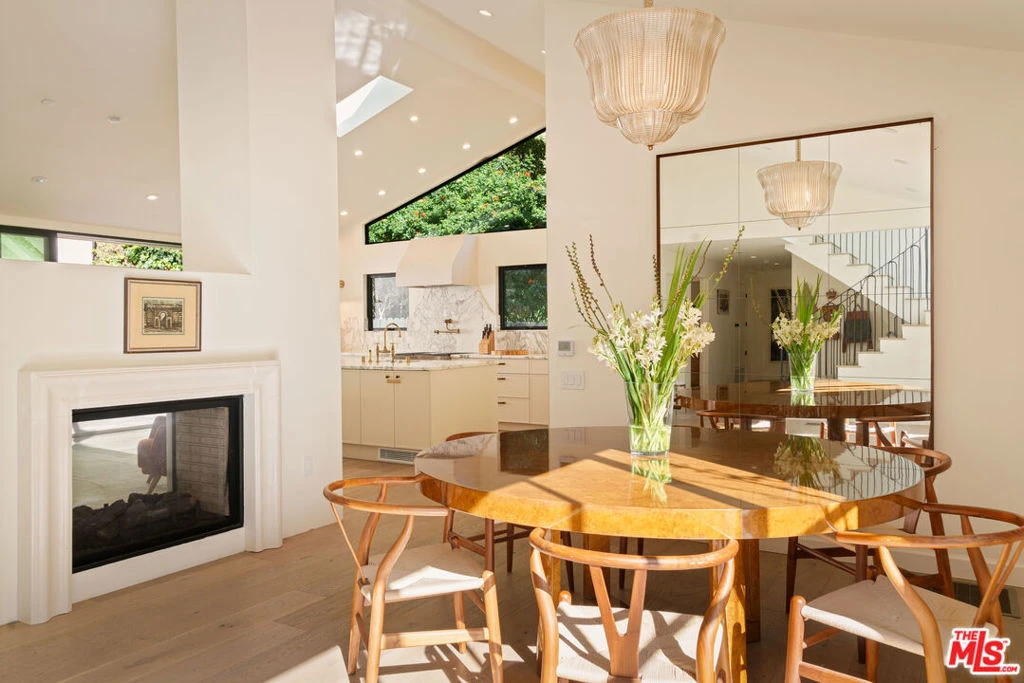 Spectacular Remodeled Brentwood Home in Mandeville Canyon. Completely rebuilt from the ground up, including a new foundation, fully reframed structure, and all-new HVAC, plumbing, and electrical, this 5-bedroom, 4.5-bathroom home is essentially brand new and has the finishes and fixtures normally found in homes in the $20M price range. An ancient olive tree in the driveway welcomes you through the black metal floor-to-ceiling doors to a sunlit open-concept living, dining and kitchen space centered around a statement fireplace. The kitchen is a true showpiece, featuring exquisite beveled-edge Arabescato marble, Sub-Zero and Wolf appliances, and DeVol fixtures and lighting. Just beyond the kitchen is a spacious laundry room and an elegant pantry. Downstairs there are three bedrooms, two share a Jack-and-Jill bathroom, and the other is en-suite. The primary is a showstopper with an open plan bathroom featuring Perrin and Rowe fixtures (Queen Elizabeth's favorite), a Water Monopoly tub, and Rosa Arabescato marble steam shower. The backyard is your own private luxury retreat, with a pool and spa, complemented by an elevated wellness deck with a sauna, cold plunge, and tranquil mountain views. Mature landscaping plus an outdoor dining and seating area with travertine and limestone tiles are crowned by the glory of all carb addicts: a pizza oven. A bonus 350 sq ft loft above the garage offers a flexible, tucked-away space ideal for an office, home gym, playroom or reading nook. There's nothing like it in this price range.