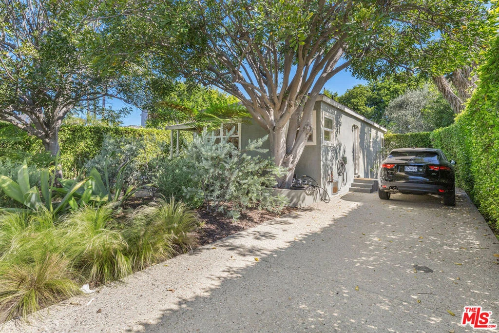 Tucked behind lush hedging and gates for ultimate privacy, this beautifully updated 2-bedroom, 2-bath bungalow blends timeless 1940s charm with modern comforts in the heart of Mar Vista. A welcoming front yard sets the tone as you enter into a bright, open floor plan featuring hardwood floors, a renovated chef's kitchen, and a built-in dining banquette, ideal for both everyday living and entertaining. The primary suite is privately situated at the rear of the home, opening through French doors to a sunny patio and grassy yard complete with a firepit and above-ground spa. A spacious secondary bedroom and bath complete the main residence. Convenient in-home laundry adds to the ease of everyday living. The outdoor spaces are equally inviting, with a large outdoor dining area under a mature olive tree, surrounded by citrus and fig trees, perfect for enjoying Southern California living year-round. A long, private driveway provides ample off-street parking with space for multiple vehicles. Adding exceptional flexibility, the detached converted garage has been thoughtfully renovated into a guest studio with its own kitchenette and bathroom, ideal for a home office, creative space, gym, or guests. A rare lease opportunity offering privacy, character, and versatile living in a prime Mar Vista location.