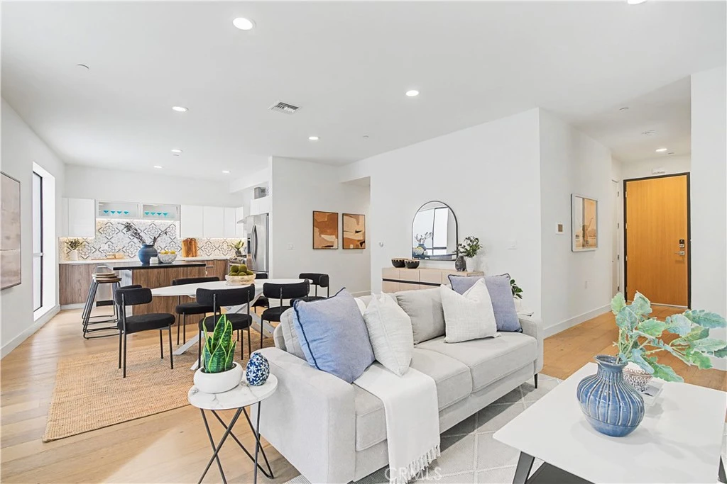 Ideally located in the heart of Mar Vista, this spacious and private corner 2-bedroom, 2-bath + office condo offers exceptional indoor-outdoor living with no neighboring units on the same level. Hardwood floors run throughout the open living area, where large sliding Fleetwood doors open to a private patio, creating seamless flow for everyday living and entertaining. The kitchen features granite and quartz countertops, Samsung stainless steel appliances, custom cabinetry, a breakfast bar, and an adjacent dining area. Both bedrooms enjoy direct access to a separate private patio, offering rare outdoor space and an added sense of privacy. The primary suite includes a walk-in closet and an en-suite bathroom. Additional features include double-pane Milgard windows, central air and heat, a tankless water heater, in-unit laundry, video security, controlled-access entry, bike storage, two-car garage parking, and a well equipped fitness center. A prime location near the Mar Vista Farmers Market, popular dining, and shopping, with convenient access to Venice and the Silicon Beach corridor, home to major tech offices including Google, Snap Inc., Meta, Amazon, and Hulu, a home like this doesn't come along often.