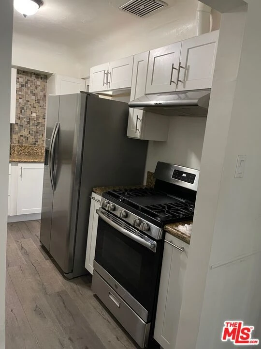 A remodeled unit of about 1,550 sq ft in the downstairs duplex, with two bedrooms and a den that can be used as a bedroom. The kitchen has beautiful cabinets with new granite countertops. Refurbished hardwood floors plus laminated floors, a washer and dryer, a wall air/heater, plus another central heating system. It requires a good credit history. There is a discount for fewer people.