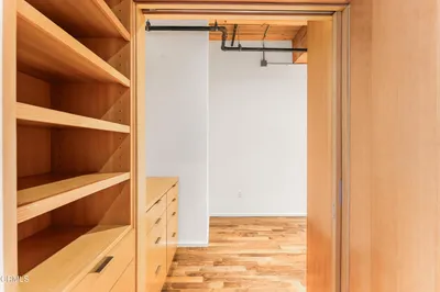 Experience the vibrance of Downtown LA from this beautifully renovated loft in the highly sought-after Arts District, located within the iconic Barker Block. Overlooking the building's lush interior courtyard, this sun-filled residence seamlessly blends architectural character with thoughtful modern upgrades designed to maximize both style and functionality. The open-concept layout is enhanced by custom renovations, including a room divider with integrated shelving and storage, a built-in TV console, and additional hallway storage, creating clearly defined living areas while maintaining the openness of true loft living. A pony wall at the sleeping area, paired with a fully enclosed closet, provides privacy and practicality. The updated kitchen features newer cabinetry and a stylish backsplash, complemented by stainless steel appliances and wood floors throughout the space. The bathroom has been reconfigured, with the washer and dryer closet relocated out of the bathroom, allowing for a more spacious layout and the addition of a double-sink vanity--a meaningful upgrade for everyday comfort. Residents enjoy a gated, covered parking space, 24/7 on-site security, and access to a resort-style rooftop complete with a heated pool and spa, fitness center, BBQ grills, fire pits, and expansive areas for relaxing or entertaining. Just steps from some of LA's best dining, coffee shops, galleries, museums, and the Arts District Park, with easy access to major freeways, Metro lines, and train stations, this home offers the perfect balance of urban energy, comfort, and convenience.
