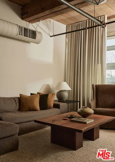 Exceptional Arts District loft in the historic Barker Block, exquisitely designed by noted interior design firm DISC Interiors. A dramatic wall of windows spans the far end of the residence, dressed in floor-to-ceiling drapery that adds warmth and texture, filling the space with an abundance of natural light and framing a coveted downtown skyline view. West-facing units with all wood ceilings and sunset exposures like this rarely come to market at Barker Block, making this residence an exceptional opportunity. This special home strikes a thoughtful balance of warmth and sophistication with hardwood floors throughout, nearly 11-foot ceilings with exposed beams, architectural lighting complemented by designer decorative fixtures, and custom built-in cabinetry providing ample storage at every turn for smart, elevated living. Warm white walls and painted-out ducting give the loft a more cohesive and softened feel. The heart of the loft is a chef's kitchen outfitted with top-of-the-line, recently updated appliances seamlessly anchoring the open layout, ideal for both everyday life and entertaining. A spacious full bath includes in-unit laundry, while the generously sized bedroom features luxurious custom curtains that provide privacy and a thoughtful separation of space. The bedroom is complemented by a large wall of custom designed closets with antique brass hardware, and a built-in wall-to-wall oak dresser. A custom built-in 16' desk with a full wall of bookshelves thoughtfully separates the entry and dining areas, adding both function and architectural interest.The Barker Block is a full-service building offering 24/7 front desk and security, complimentary common-area WiFi, an outdoor lounge with fire pits, and a resort-style rooftop with heated pool, spa, BBQ areas, and a fitness center showcasing some of the best panoramic views in downtown Los Angeles. Known for its striking architectural details and timeless industrial character, the live/work designated Barker Block also offers a dynamic and sophisticated creative community spirit.Located in the heart of the Arts District, moments from Bavel, Girl and the Goat, Verve Coffee, Blue Bottle Coffee, as well as walking distance to Still Life Ceramic Studios, Dover Street Market, Bestia, Soho Warehouse, and art galleries such as Hauser & Wirth, this exceptional loft delivers a rare blend of architectural pedigree, thoughtful design, and a vibrant, walkable urban lifestyle.