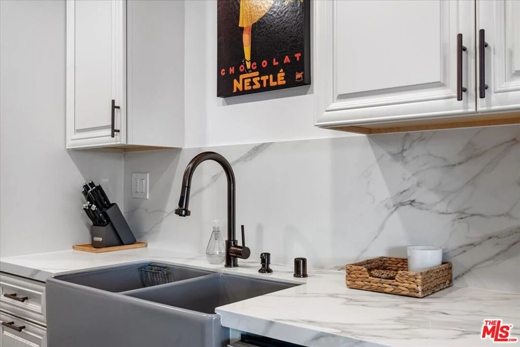 Sophisticated luxury meets Brentwood convenience in this stunning 2-bedroom, 2-bathroom back corner residence. Ideally situated in the quiet rear of the building, this home offers a serene retreat just steps from San Vicente Boulevard's world-class dining, boutique shopping, and the iconic Sunday Farmers Market. ***THE RESIDENCE: Step through an elegant double-door entry into an expansive open-concept floor plan with soaring high ceilings and designer recessed lighting. The heart of the home is a true chef's showpiece, featuring a luxury kitchen anchored by a custom imported Italian stone waterfall island with breakfast bar seating. High-end finishes include a double convection oven, a sleek floating hood, and oversized designer tile flooring, all flowing seamlessly into the dedicated dining area and spacious living room. The primary suite is a massive sanctuary, featuring ample closet space, direct patio access, and a spa-like ensuite bathroom with custom large-format tile and mosaic flooring. The generous second bedroom offers a walk-in closet and easy access to a second bathroom with premium designer shower tiles. Hybrid resilient flooring and high-end fixtures throughout provide a modern, cohesive aesthetic. ***BUILDING AND LIFESTYLE: This well-maintained, all-electric building is designed for an active and effortless lifestyle. Residents enjoy premium amenities including a pool, spa, sauna, and a fully equipped gym. For maximum convenience, the building features two dedicated laundry rooms on every floor, plus a large, app-based laundry center located in the garage. This unit includes two covered tandem parking spaces in a secure, gated garage with a private storage cabinet, plus rare guest parking located behind the building off Terryhill. ***SECURITY AND ACCESS: On-site maintenance (M-F, 9am-6pm) and controlled buzzer access at two separate entrances (612 and 622 S. Barrington). HOA fee includes earthquake insurance, water, sewer, and trash.