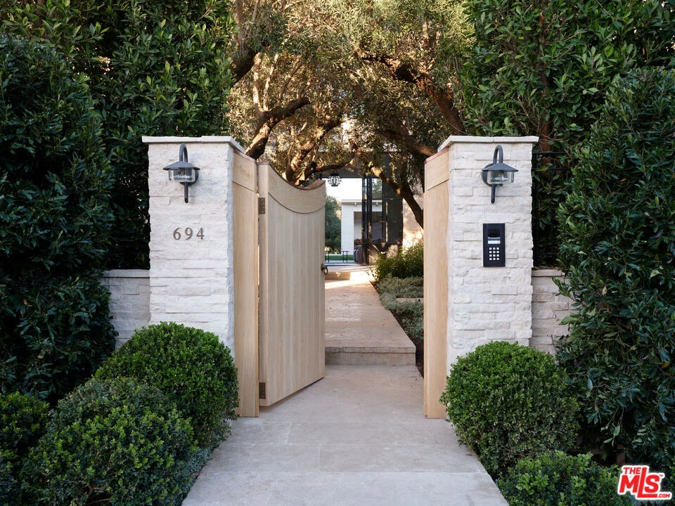 Designed by Concept by C, with landscape architecture by Christine London and fully envisioned by The Gesh Group, this residence feels less like a home and more like a fully realized world unto itself. The approach sets the tone immediately with sculptural olive trees arching over a lantern-lit garden path, limestone underfoot, and steel-framed glass doors revealing a softly illuminated interior beyond. There is a quiet gravity to the architecture, with every proportion and material choice curated with intention. Inside, lime-washed walls, limestone flooring, and custom oak paneling create a layered, tactile depth where light lingers and moves with the day. The home unfolds effortlessly, with each stone-encased threshold revealing thoughtfully composed living and entertaining spaces, finished with immaculate attention to detail. The kitchen is the heart of the home, anchored by a Wolf range, integrated Sub-Zero appliances, and a striking L'Atelier Paris range set against marble surfaces and artisan tilework. Fixtures are carefully selected, allowing stone, wood, and texture to carry the narrative throughout. Living spaces are immersive and atmospheric firelight against carved stone, linen drapery diffusing golden light, floor-to-ceiling windows capturing greenery from every angle. Multiple lounge areas across levels create a rhythm of gathering and retreat: a piano room and bar wrapped in antiqued mirrors, an upstairs den overlooking the grounds, and intimate seating vignettes that feel curated rather than staged. The lower level shifts into a more enveloping mood, where reclaimed brick and beam ceilings frame a wine room, built-in bar, and a private theater designed for complete immersion. Beyond, a dedicated wellness suite complete with steam, sauna, gym feels transportive, as though carved from stone.The primary suite is its own sanctuary. A custom fireplace and wet bar ground the space, while dual spa baths clad in marble, limestone, and European hardware continue the home's bespoke language of material richness. Outdoors, architecture and landscape dissolve into one another. A manicured lawn meets still water at dusk, the facade reflected in the pool's surface. Echoing the copper roof detailing, a covered gazebo with copper fireplace lounge extends evenings under open sky, along with a built-in Wolf barbecue and dining area. What emerges is not just a residence, but an experience shaped by proportion, materiality, and landscape. In a neighborhood of remarkable homes, this one stands apart: composed, transportive, and entirely singular.