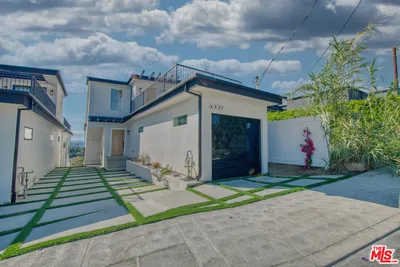 Surrounded by mature trees and set within one of the area's most scenic hillside pockets, this charming Hollywood Hills two-story retreat spans multiple parcels and offers a peaceful take on Southern California living. Featuring 1BD/ 2BA plus a versatile loft, the home showcases sweeping canyon views, original mid-century finishes, and undeniable character. Upon entry, a sunlit living room welcomes you with newly installed engineered wood flooring and expansive windows that frame the natural surroundings. Just a few steps up from the living room, an elevated nook provides the perfect space for a home office, accompanied by a powder bath and a charming kitchen complete with ample cabinetry and stained-glass skylights and windows that add warmth and personality. The kitchen flows into a formal dining area, where sliding glass doors open to a serene patio, ideal for indoor-outdoor living. Upstairs, the inviting loft features rich wood paneling, a motorized skylight, and impressive views stretching toward Universal Studios and the surrounding canyons. The loft connects to a bedroom with generous closet space and an ensuite bath, highlighted by an oversized shower with vibrant tilework. Outdoors, enjoy a quiet patio and a terraced garden overlooking the canyon, offering privacy and a tranquil, nature-filled setting. Additional amenities include a laundry area off the powder room with a newer washer and dryer, as well as a two-car garage. Ideally located moments from the Hollywood Bowl, Runyon Canyon, major studios, and some of LA's most popular dining and nightlife destinations, this unique property presents a rare opportunity to enjoy character, privacy, and scenic views in a quiet hillside setting. Included in the sale are two additional parcels (APNs 2428-010-011 and 2428-010-012), offering expanded space, enhanced privacy, and potential for future use or development.