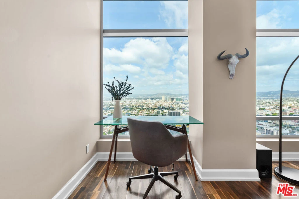 Perched on the 40th floor of the prestigious Ritz-Carlton Residences, this exquisite condominium offers an unparalleled blend of sophistication, service, and stunning panoramic views. From the moment you step inside, you're captivated by breathtaking vistas that stretch from the majestic mountain ranges to the shimmering Pacific Ocean, all framed by the city's dynamic skyline. The open-concept kitchen is a chef's dream, featuring an ample sized island, sleek Snaidero Italian cabinetry and top-of-the-line Gaggenau appliances. The living area is equally impressive, boasting Danish hardwood floors, near floor-to-ceiling windows, and soaring 10-foot ceilings that showcase iconic sights such as the Hollywood Sign and Griffith Observatory. Both bedrooms are spacious retreats, each with a luxurious ensuite bathroom. The primary suite offers a spa-like oasis, complete with a soaking tub, floor-to-ceiling tile, and a unique window into the bedroom to maximize natural light and enhance the views. Storage is abundant, with a walk-in closet in the primary suite and a double-door closet in the entryway area. Additional highlights include motorized window shades, custom light fixtures, a powder room with laundry, and a versatile den perfect for a home office or cozy lounge space. Beyond your private sanctuary, indulge in the legendary white-glove service of The Ritz-Carlton. Enjoy in-residence dining, housekeeping services, and exclusive owner perks, such as VIP event access and hotel discounts worldwide. Take the elevator down to the Ritz-Carlton Spa for a rejuvenating massage or steam session, or explore the renowned on-site dining and entertainment offerings just steps away. Whether it's courtside seats at a Lakers game, a Kings hockey match, or a headlining concert, the city's best experiences are at your doorstep. This coveted residence includes two valet parking spaces and a storage unit. Experience the perfect blend of luxury, convenience, and world-class services. Schedule your private tour today.