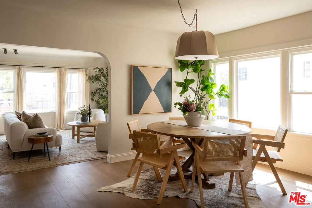 This beautifully restored 2 bed, 2 bath Spanish upper residence at 929 S. Sycamore Ave pairs timeless architectural character with a refined, design-driven renovation in the heart of Mid-Wilshire. Brought to you by Cassa Design Studio, original details such as coved ceilings, arched openings, a Batchelder tile fireplace, and built-in niches have been thoughtfully preserved. A private entrance and elegant staircase lead to a residence that lives like a true home, filled with abundant natural light from windows and offering a bright, airy living experience. The reimagined layout flows effortlessly, centered around a designer kitchen with dark granite countertops, an Arabescato porcelain backsplash, stainless steel appliances, and a Portola Roman clay range hood. Sage green cabinetry at the island and coffee bar introduces a subtle, curated contrast. Both bathrooms reflect a refined, design-forward approach. The guest bath pairs sage green zellige-inspired tile with classic Spanish flooring, while the primary bath features a double vanity and an oversized walk-in shower with black penny marble tile and Arabescato porcelain surfaces. A customizable walk-in closet completes the primary suite. Curated brass fixtures and statement lighting bring warmth throughout. Additional upgrades include HVAC, in-unit laundry, fully wired A/V with Cat6, Ring doorbell, and Nest thermostat. A private yard surrounded by Mediterranean-inspired landscaping offers a quiet retreat. The gated property includes two tandem parking spaces with dedicated EV charging capability. Situated in a highly coveted neighborhood near Museum Row and the upcoming Purple Line, and just around the corner from Lassens, Republique, All Season Brewing Company, Met Her At A Bar, LACMA, and Hancock Park, this residence offers a refined blend of design, comfort, and modern living.
