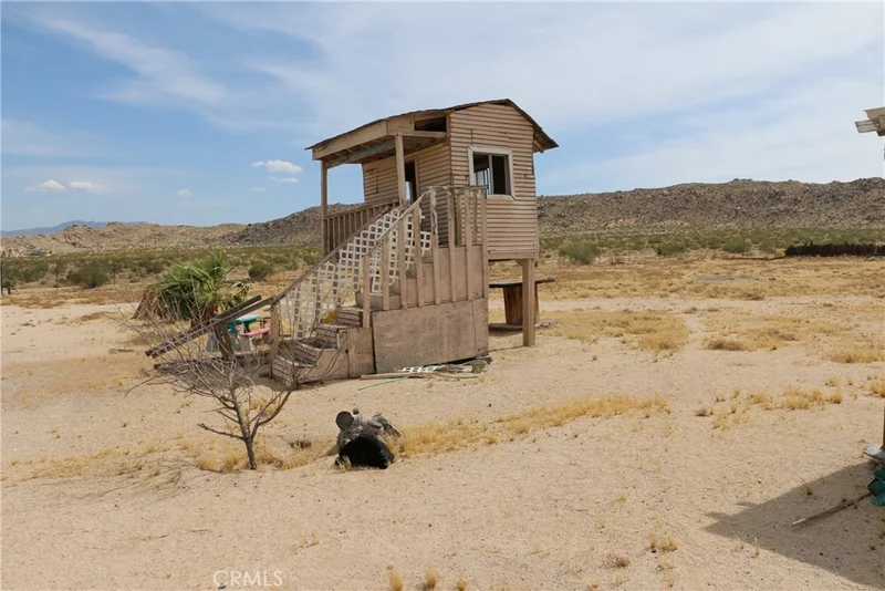 Ditch the daily grind and embrace tranquility in this secluded 2-acre sanctuary. Majestic mountain vistas unfold before you, offering a breathtaking backdrop to your escape. Leave the noise behind – with no close neighbors, peace and quiet reign supreme. This fully fenced property shelters a charming 2-bedroom, 2-bathroom mobile home. Permanently secured on a foundation, it offers stability and ease of ownership. Embrace self-sufficiency with a private water well, a 5,000-gallon water tank, and a septic system. Solar panels harness the sun's power (a new battery is needed to maximize efficiency). Step inside to The spacious living area is ideal for unwinding or entertaining. Mingle around the convenient wet bar, enjoy casual meals at the breakfast counter, or utilize the expansive laundry room with ample storage. Year-round comfort is ensured with window AC units. The master suite is your personal oasis. Relax in the dedicated dressing area with a vanity, a dual mirrored closet, and a private bathroom. Outdoor living takes center stage. Indulge in the breathtaking scenery from the delightful gazebo, the large wraparound deck, or the back-covered patio. Lush palm and fig trees add a touch of tropical paradise. Calling all adventurers and investors! This property holds immense potential. Transform it into a thriving vacation rental for those seeking thrills at the nearby King of the Hammers event in Johnson Valley. Soggy Dry Lake offers additional outdoor recreation opportunities. This haven is also perfect for those seeking a peaceful weekend escape. Don't miss out on this unique opportunity! Schedule your appointment today. Please note: The second mobile home and debris will be removed before closing. The two containers and some furnishings are negotiable. Appliances are not included in the sale.