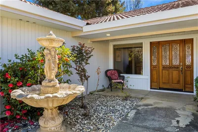 Waterfront living in gated Paradise Cove! This beautifully designed home offers over 2,700 square feet with spectacular waterfront and Mount Konocti views. Formal entry opens to a step-down living room with wood-beamed ceilings, pellet stove with brick surround, and a dramatic wall of windows framing the water. Spacious kitchen is open to the dining/living area and built for entertaining, featuring granite counters, breakfast bar, built-in refrigerator, and double ovens. The generous waterfront primary suite includes a pellet stove, walk-in closet, double sink vanity, soaking tub, and tiled walk-in shower. Two ensuite guest bedrooms each offer walk-in showers and ample closet space, providing comfort and privacy for visitors. Additional highlights include central heat and air, walk-in pantry, inside laundry, and an attached three-car garage. Beautifully landscaped front yard with fountain and porch and back yards lead to a lakeside patio overlooking Mount Konocti and Paradise Cove Marina. Metal stairs lead to private dock for easy lake access. Located in the sought after Paradise Cove community with tennis courts, picnic area, and private boat launch — the ideal setting for enjoying Lake County waterfront living.