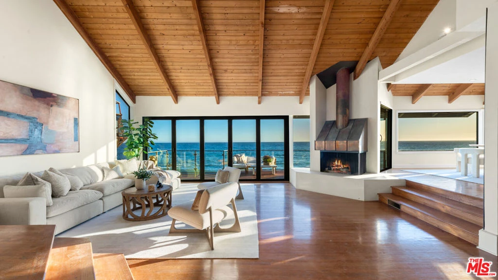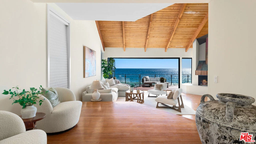 Step through the grand double-door entry into a sunlit foyer where sweeping ocean views unfold before you. Rich wood floors set a warm and inviting tone, while the natural beauty of the Pacific is immediately on display. To the left, a stylish powder room offers stone counters, a custom vanity, and a sleek sink, creating an ideal space for guests to refresh. Descending just a few steps, the home opens into a stunning sunken living room with soaring vaulted ceilings adorned with exposed wood beams and skylights that bathe the space in light. A striking fireplace creates a cozy focal point, while a sophisticated wet bar with granite counters, built-in cabinetry, and a bar sink elevates the space for entertaining. Accordion-style sliding glass doors dissolve the boundary between indoors and out, revealing an expansive oceanfront deck with glass railings. From here, panoramic coastline views stretch from the sands below to the distant skyline of Los Angeles. To the right of the foyer, the chef's kitchen impresses with a blend of modern amenities and timeless design. Recessed lighting highlights the wood floors, granite counters, and an illuminated stone backsplash. A six-burner Viking range with double ovens, a Viking hood fan, Subzero fridge and freezer, and Miele microwave make this kitchen fully equipped for culinary excellence. A large island with built-in storage and a prep sink anchors the space, complemented by a granite breakfast bar. The kitchen flows seamlessly into the formal dining area, where sliding glass doors open to a second deck, once again framing those incredible ocean vistas.Throughout the home, modern conveniences abound, including central air conditioning and heating, a tankless water heater, and direct access to the two-car garage.Upstairs, a skylight brightens the hallway leading to a spacious guest bedroom, where vaulted wood-beamed ceilings, a ceiling fan, and generous natural light create a peaceful retreat. This room includes a walk-in closet and an en suite bathroom with tile floors, a vanity, and a shower over tub. Across the hall, the primary suite offers luxurious comfort, complete with plush carpet flooring, stained glass accents, vaulted wood-beamed ceilings, and a gas fireplace. Sliding glass doors open to a private deck overlooking the ocean. The en suite bathroom features a built-in jetted tub, a spacious walk-in shower with dual showerheads, a private water closet, and an oversized walk-in closet, while an additional door conveniently accesses the garage level. The lower level reveals additional living space with wood floors, recessed lighting, and more ocean views. A secondary family room opens directly to another oceanfront deck. To the right, a bedroom with high ceilings and direct deck access features an en suite bath with wood floors, a mirrored closet, and a tiled shower. Another guest bedroom across the hall offers sliding glass doors to the deck, wood floors, recessed lighting, and mirrored closet doors. A Jack and Jill en suite bathroom, complete with stone counters, a vanity, and a tiled shower stall, connects the two rooms.Nearby, a laundry area with a stacked washer and dryer is tucked behind a sliding wood door and leads to a recreation space with a ping-pong table and additional storage with mirrored closets.For ultimate privacy, a separate guest suite completes the lower level, offering wood floors, a kitchenette, dining area, and sliding glass doors to a private ocean-view deck with beach access. The guest bedroom includes a mix of wood floors and soft carpeting, a walk-in closet, and an en suite bath with a walk-in shower and vanity. A dedicated elevator connects every level of this thoughtfully designed residence, where luxury meets comfort and spectacular coastal scenery surrounds you at every turn.