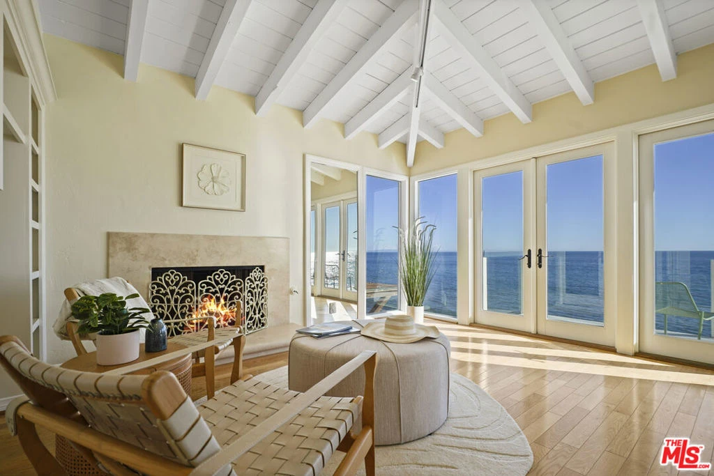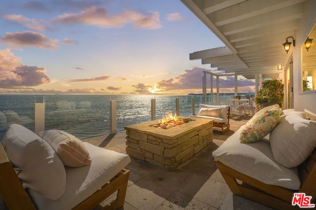 Enjoy the art of beachfront living in this elegant five-bedroom home, ideally situated on a guard-gated street for the ultimate in exclusivity and peace of mind. A serene courtyard entry welcomes you into a covered loggia with a soothing spa, outdoor fireplace, and lush greenery creating a tranquil oasis before you even step inside. Upon entering, rich hardwood floors flow seamlessly throughout the home's sunlit, open-concept layout. Both the living and family rooms feature fireplaces, sweeping ocean, coastline and city light views, opening directly onto an expansive seaside deck with a fire pit perfect for effortless entertaining and sunset gatherings. The main level includes a private en-suite bedroom with its own entrance, ideal for guests. Upstairs, the oceanfront primary suite offers a private balcony, fireplace, and walk-in closet, creating a true sanctuary with panoramic views of the Pacific. Three additional bedrooms complete the upper level, each bright and spacious. Three additional bedrooms complete the upper level, and all feature vaulted, beamed ceilings that enhance their bright, airy, coastal charm. Set directly on the sand, the entertainer's deck offers direct access to the water's edge and your own charming surf shack. Modern comforts include an electric car charger, a three-car garage, and additional private parking. Blending luxury with relaxed coastal living, this home perfectly captures the essence of life at the beach. *Burning fire in fireplaces and fire pit have been digitally added.