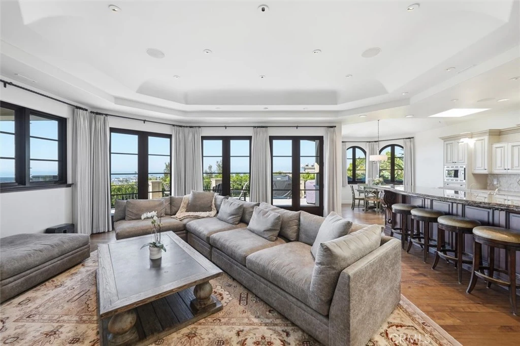 Located in the prestigious Hill Section of Manhattan Beach, this stunning Mediterranean estate offers panoramic ocean views stretching from Palos Verdes to Catalina. Situated on an oversized 7,503 square foot lot, this 5,586 square foot home combines timeless architecture, exceptional space, and an ideal coastal indoor/outdoor lifestyle. A dramatic entry welcomes you with travertine floors and a sweeping curved staircase, setting the tone for the home’s elegant design. The ground level features four bedrooms and a spacious family room that opens to the west-facing backyard, creating seamless indoor/outdoor flow. The backyard includes a jacuzzi and offers plenty of room for a pool, making it ideal for outdoor living and entertaining. The primary suite opens directly to the backyard, creating a private retreat. Upstairs is the main living level designed to capture the panoramic views, featuring the kitchen, family room, formal dining room, ocean-view office with custom wood built-ins, theater room, and a flexible space that could serve as a fifth bedroom. The open floor plan flows to a large ocean-view terrace, perfect for entertaining, dining, and enjoying sunsets over the Pacific with views of Palos Verdes and Catalina. Hardwood and travertine floors run throughout the home, and a basement level provides additional space ideal for a gym, wine cellar, and extra storage. With its oversized lot, expansive square footage, panoramic views, and prime Hill Section location, this is a rare opportunity to own a premier Manhattan Beach view property just minutes from downtown Manhattan Beach, award-winning schools, and the beach.