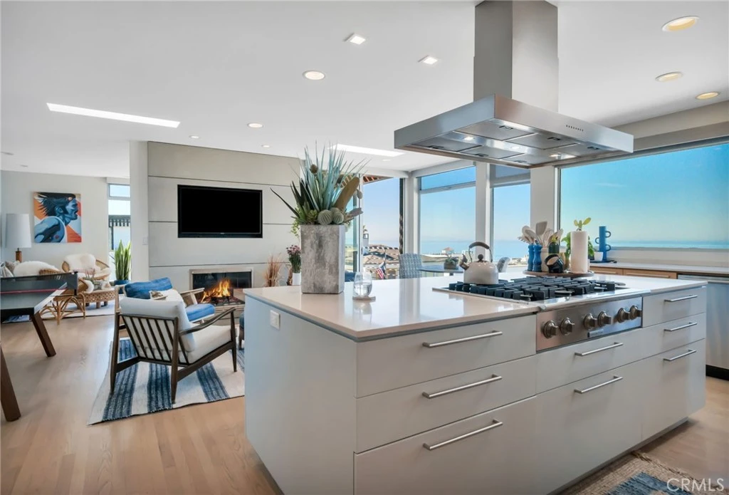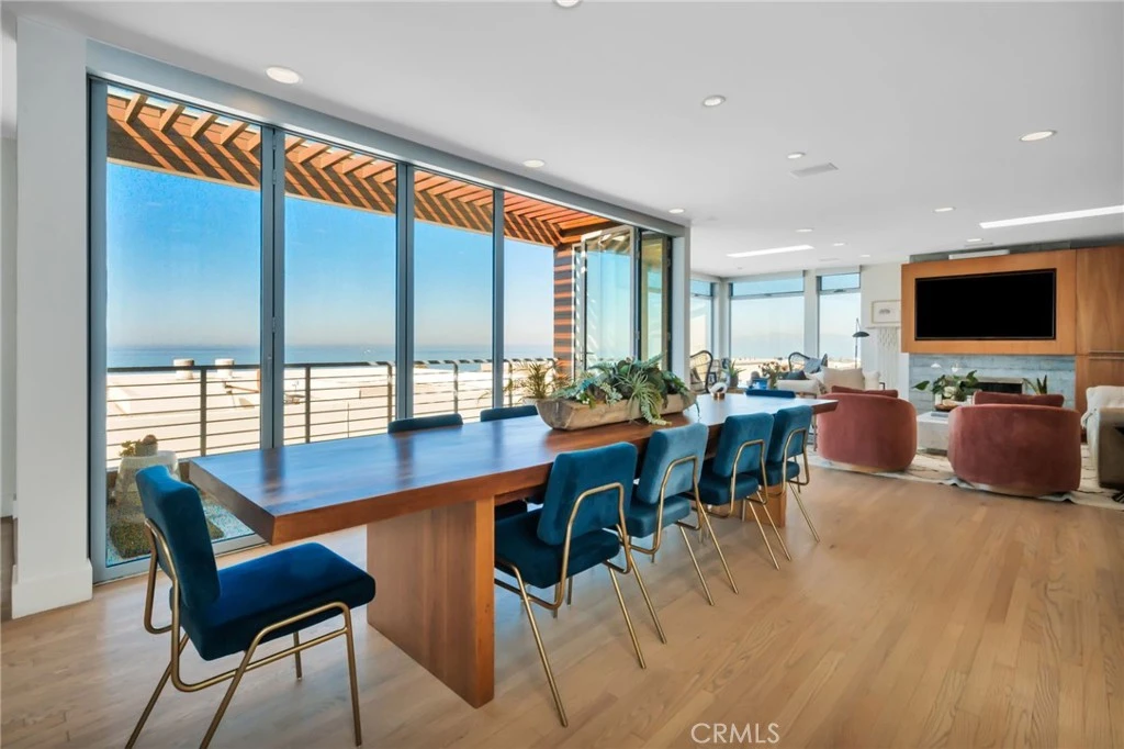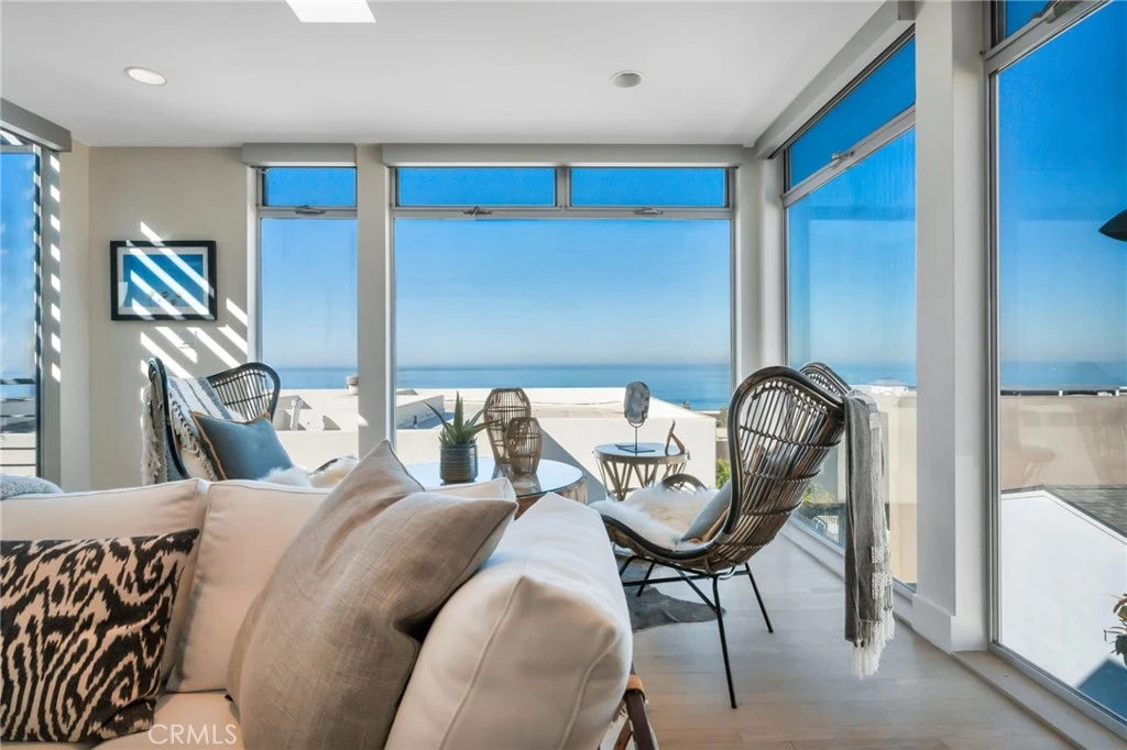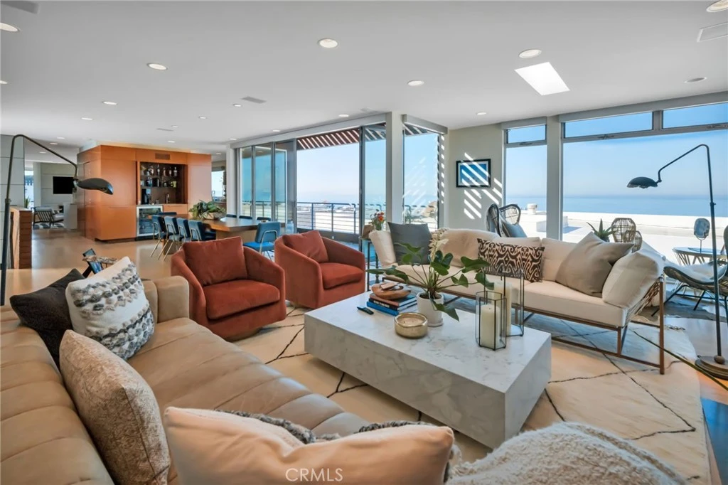 Perched on one of the most coveted walkstreet 100-block lots in Manhattan Beach, this exceptional residence offers spectacular, permanent ocean views—a rare advantage created by its unique positioning adjacent to two 60’ x 45’ lots that preserve sightlines and enhance privacy. Originally reimagined from the studs by renowned architect James Meyer of Lean Arch, the home embodies a clean, minimalist aesthetic with a serene, light-filled ambiance throughout. Thoughtfully designed, it features 4 bedrooms plus a good as it gets ocean view office, 4.5 baths, plus a versatile lower-level guest suite with a custom Murphy bed—which can serve as the 4th bedroom (BTV). The top floor showcases breathtaking, unobstructed west-facing views stretching from Point Dume to Catalina Island. A stunning great room seamlessly blends indoor and outdoor living, with expansive folding Nanawall doors opening to panoramic ocean vistas—perfect for entertaining or simply enjoying the coastal lifestyle. The primary suite is a true sanctuary, offering ocean views, a generous walk-in closet, and a spa-inspired bath complete with terrazzo floors, a luxurious two-person Neptune soaking tub, and an oversized frameless dual shower. The lower-level guest suite is equally impressive, featuring a custom Murphy bed, walk-in closet, and a stylish beach room with an entertaining bar, mini refrigerator, and ice maker. The ensuite bath is beautifully appointed with terrazzo flooring and a frameless glass tile shower. Additional highlights include a 3-stop elevator, 6 car parking, integrated Crestron sound system, Lutron electric blinds, and countless custom details throughout. A rare opportunity to own a design-forward coastal retreat with enduring ocean views in one of Manhattan Beach’s most sought-after locations.
