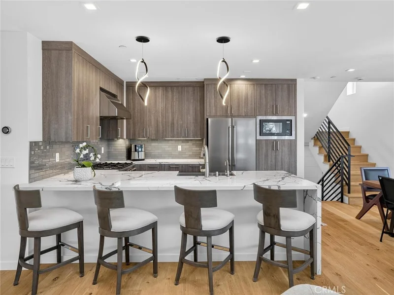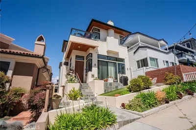 This stunning East Manhattan Beach rear townhome offers the rare luxury of two backyard spaces—one common area and one for exclusive use. Per the builder, the home spans approximately 2,135 square feet across three levels, featuring 3 bedrooms, 3 bathrooms and soaring ceilings throughout. Upon entering the mid-level, you are welcomed by a beautifully appointed open-concept kitchen with a large center island, seamlessly connected to a generous dining area designed to accommodate even the largest holiday gatherings. The spacious family room is bathed in natural light from an impressive array of windows and anchored by a cozy gas fireplace, creating a warm and inviting atmosphere. This level also features the primary bedroom suite with a spa-like bathroom highlighted by a freestanding soaking tub. A secondary bedroom and additional full bath complete this thoughtfully designed floor. The top level showcases a stylish loft/workspace that opens to a 178-square-foot deck, complete with a portable sauna that the owners will leave—an exceptional retreat for relaxation or entertaining. Downstairs, bedroom three opens directly to the private yard, offering ideal flexibility for guests, a home office, or extended living space. The two car garage also has a TESLA battery plus extra under roof parking on the apron right in front of garage. This is a truly special home that blends space, light, and unique indoor-outdoor living.