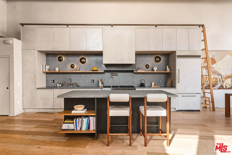 A rare, Architectural Digest featured penthouse loft offering the ultimate blend of beach, city, and loft living. This top-floor corner unit with only one common wall features soaring 17-foot ceilings, dramatic city views, and a light-filled two-story open floor plan designed for both everyday living and creative expression.The loft's transformation includes over $225,000 in bespoke upgrades, highlighted by Kamp Studios' signature natural, eco-friendly matte plaster throughout, including a custom plaster finish for the kitchen cabinetry. Handcrafted wood and brass elements by Cooper Reynolds define the space, from the statement kitchen island to custom ladder. The kitchen is a true centerpiece, featuring custom Italian cabinetry by Aria Design, Grey Atlantis Stealth quartz slabs, artisanal detailing, and a full suite of top-of-the-line Viking appliances, including a 48" all-gas professional range and custom-panel refrigerator.Curated designer lighting and furnishings include Noguchi Akari light sculptures, handmade wall lighting by Cuff Studio, custom bar stools by Thomas Hayes, and a one-of-a-kind art installation by Hannah Polskin. Adding a personal touch, the owner designed a bespoke boucle sofa, "Freya," now part of Nathan Anthony's permanent collection. Ideally located just a 2-minute walk to Villa Marina Marketplace, offering Equinox, AMC Theater, Gelson's, and an array of shops and restaurants. The building also features a Kelly Wearstler designed courtyard, along with a gym, pool, spa, secured guest parking, and two secured underground parking spaces.A truly special penthouse loft where elevated design, privacy, and walkable coastal living converge.