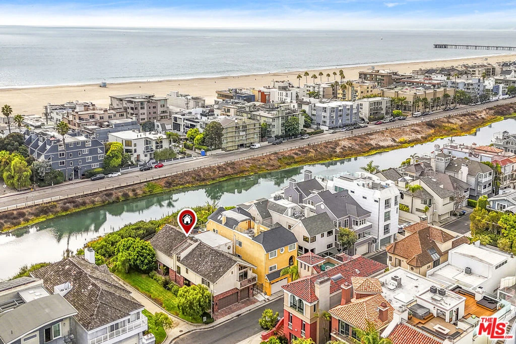 This waterfront, corner lot home with impressive views is located only a block from the Pacific ocean and steps to the main channel. Incredible detail, and design complement this beach home with wonderful outdoor spaces and amazing views on each level. The main floor boasts gorgeous hardwood parquet floors throughout with a stunning fireplace, built-in exquisite wood bar with stool seating. Open-concept with a beautiful dining space leading the large kitchen with a breakfast eating area next to sliding glass doors opening to a private patio. Expansive and airy primary suite with soaring ceilings, sitting area with a fireplace, stunning built-ins, and private double-wide balcony. The ensuite bath has a separate shower and tub with a private dressing area complemented with a walk-in closet, vanity table, and additional closet space. The second bedroom is big and bright with a walk-in closet and ensuite bath. The third bedroom has ample closet space, ensuite bath, and large slider leading to its private outdoor balcony. Top-floor landing walks out to an enormous indoor-outdoor enclosed roof deck perfect for entertaining. Three-car garage with room for two additional cars outside. This home has the location, canal views, and large square footage with a flexible floor plan that makes living at the beach fantastic!