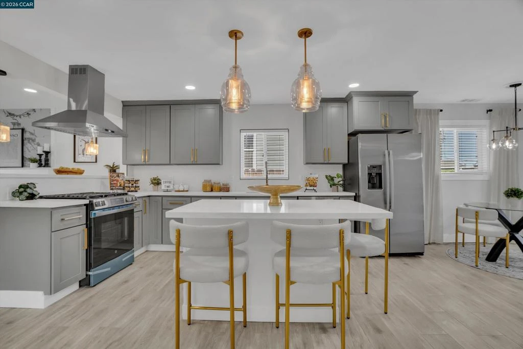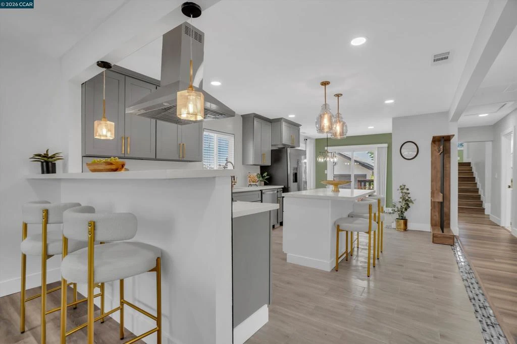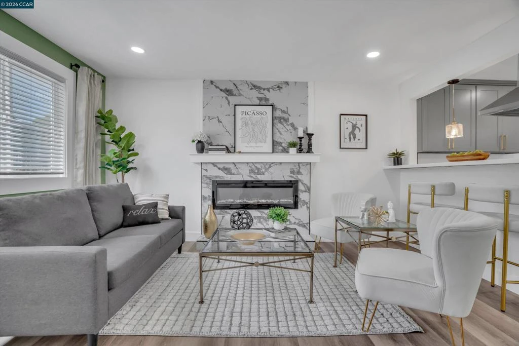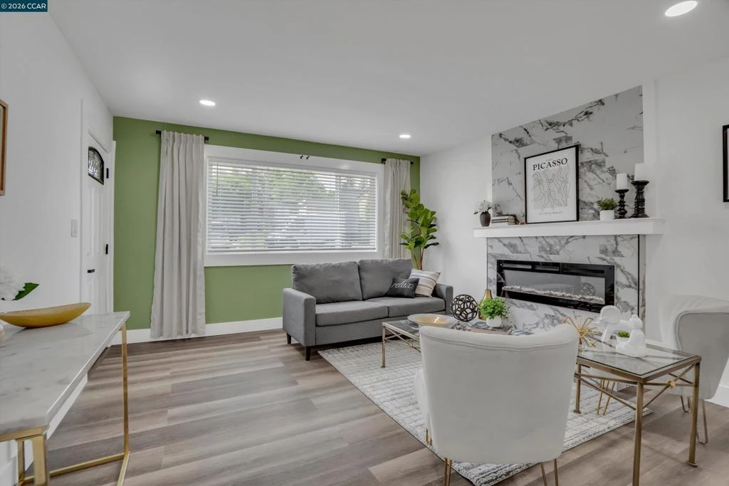Welcome to this beautifully reimagined four-bedroom, two-bath tri-level home in the heart of Martinez, where modern upgrades meet timeless comfort and style. Completely redone from top to bottom, the stunning kitchen is a true centerpiece, featuring new cabinetry, quartz countertops, tile flooring, designer lighting, a spacious island, breakfast bar, and brand-new stainless steel appliances—perfect for both everyday living and entertaining. This elegant residence offers a warm and inviting atmosphere with laminate flooring, an electric fireplace, designer paint accent walls, recessed lighting, and new window blinds throughout. The private primary suite offers a serene retreat with a beautifully updated en-suite bathroom, while the hall bath is equally refined with a new vanity, tile shower, and custom enclosure. Enjoy peace of mind with major improvements including a new HVAC system and newly poured concrete driveway, walkways, garage floor, and back patio. Outdoor spaces shine with a deck, patio, front lawn, planter boxes, and automated irrigation. Located near vibrant downtown shops, restaurants, Marina Park, and top-rated schools, this home truly has it all.
