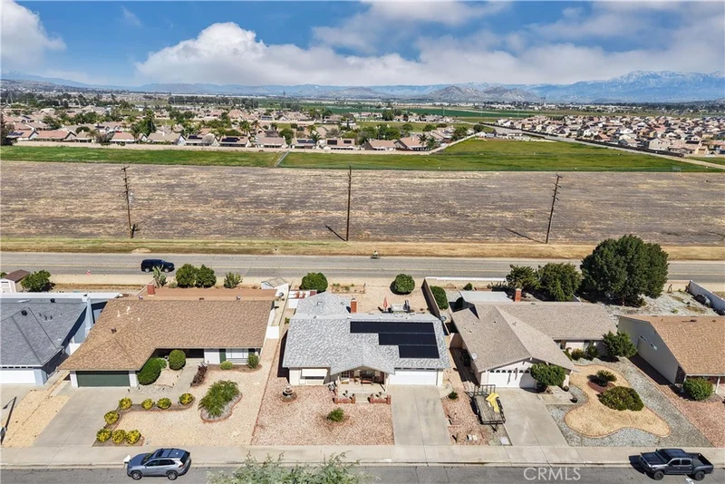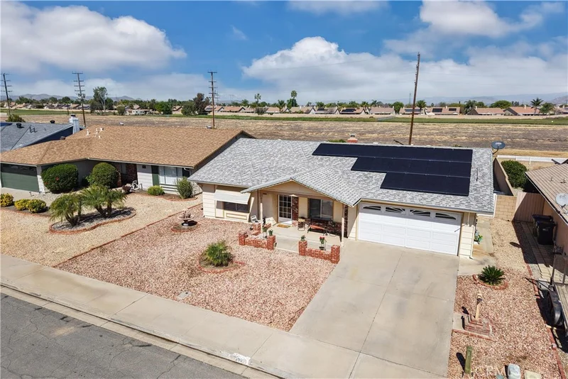 Beautiful turnkey single-story home nestled in a desirable and peaceful Sun City Senior 55+ neighborhood, with NO HOA. This inviting 2-bedroom, 2-bath home offers a spacious open floor plan featuring a formal living and dining room, an expansive family room, indoor laundry, and an attached two-car garage. The kitchen showcases Corian countertops, with a Breakfast Bar, and even offers mountain views from your kitchen sink. Adjacent is the family room, with a cozy brick fireplace with gas logs — perfect for relaxing evenings at home. Newer Luxury Vinyl Plank Flooring in the Formal Dining Room, Kitchen and Family Room. Enjoy quiet evenings in the private, low-maintenance backyard complete with a newer SPA, covered patio, large storage shed, and two mature citrus trees. This home, built in 1985, offers comfort, functionality, and exceptional value — an opportunity you won’t want to miss. Solar is less than $115 per month and has saved current owners hundreds of dollars each year in electricity costs!