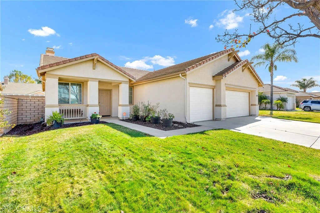 Move-in ready, well-maintained single-story home offering over 1,700 sq ft of living space. Features formal living and dining rooms, plus an open-concept kitchen with tile island that flows into the family room with a cozy fireplace Sliding doors provide exterior access to a newer aluminum wood-covered patio, perfect for relaxing or entertaining. The spacious primary bedroom includes a ceiling fan, large walk-in closet, and an en-suite bath with double sinks, a separate shower, and an oversized soaking tub. Guest bedrooms are generously sized and feature carpet and ceiling fans .Guest bathroom is roomy with a combo tub and shower. Additional highlights include an inside laundry room, tile flooring throughout the main living areas, a fully fenced large backyard with covered patio, and a three-car garage—ideal for gatherings with family and friends. Ideally located near a newer shopping center and just minutes from both the 215 and 15 freeways, offering easy access for commuting and daily errands. SOLAR WILL BE PAID OFF AT CLOSE OF ESCROW.