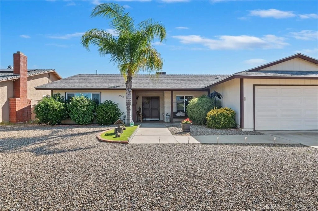 Welcome to resort-style living in the highly desirable 55+ community of Sun City Civic Center in Menifee. This beautiful single story is truly move-in ready. The double door entry takes you into the spacious open floor plan featuring attractive laminate flooring in the living room, family room, primary bedroom and dressing area. The dining room, hallway, kitchen, laundry room and bathrooms and finished with durable ceramic tile for easy maintenance. This home offers several upgrades, including newer windows, custom paint on both cabinetry and interior walls throughout. The kitchen features upgraded lighting, stove, cooktop, refrigerator and convenient breakfast bar for casual dining. The laundry room is tiled and includes a second refrigerator and the washer & dryer- all included with the property. The primary bedroom has beautiful laminate flooring, large mirrored wardrobe closets, sliding door access to the backyard and a dressing area with a vanity. The adjoining bathroom is tiled and includes a tub/shower combination. The guest bedroom has cozy carpet and offers a spacious walk-in closet and also has a connecting door into the guest bathroom. The backyard is designed for low maintenance living with desert landscaping, patio area and a fully fenced yard- perfect for entertaining. There is a 2 car garage with a work bench area and shelves for extra storage. Community amenities abound including 2 sparkling pools, spa, fitness center, shuffleboard, lawn bowling, horseshoe pits and countless clubs and activities. With low HOA. This is senior living at its finest! Do not miss the opportunity to call this lovely home your own!