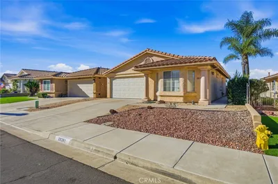 CASA BLANCA SENIOR LIVING AT ITS FINEST! Welcome to this charming 2-bedroom, 2-bathroom home located in one of Menifee's most popular 55+ subdivisions. This residence features a beautiful front elevation with enhanced exterior lighting and a private side-entrance for added security and curb appeal. The interior offers a functional kitchen with newer appliances, a gas cooktop, and a breakfast bar that opens directly to the living area—perfect for hosting friends and family. The floor plan is thoughtfully designed with bedrooms at opposite ends of the home to ensure guest privacy. Step outside and you'll find a pleasant, low-maintenance backyard. Equipped with an Alumawood patio cover, enjoy breathtaking local sunsets and mountain views. Residents enjoy premier community amenities just a short walk away, including an Olympic-size pool, spa, tennis courts, and a clubhouse featuring a massive outdoor fireplace and BBQ area. Perfectly situated near the ever-expanding Menifee Marketplace, shopping, dining, and easy I-215 freeway access. With its ideal location, "split-wing" bedroom privacy, and world-class community perks, 28281 Via Cascadita is more than just a house—it’s an invitation to join a thriving, active community. Enjoy the peace of a well-lit, safe environment and the excitement of being minutes away from the best shopping and entertainment in the region. Experience the comfort and convenience of living in Southern California’s fastest-growing city! Make it yours today!