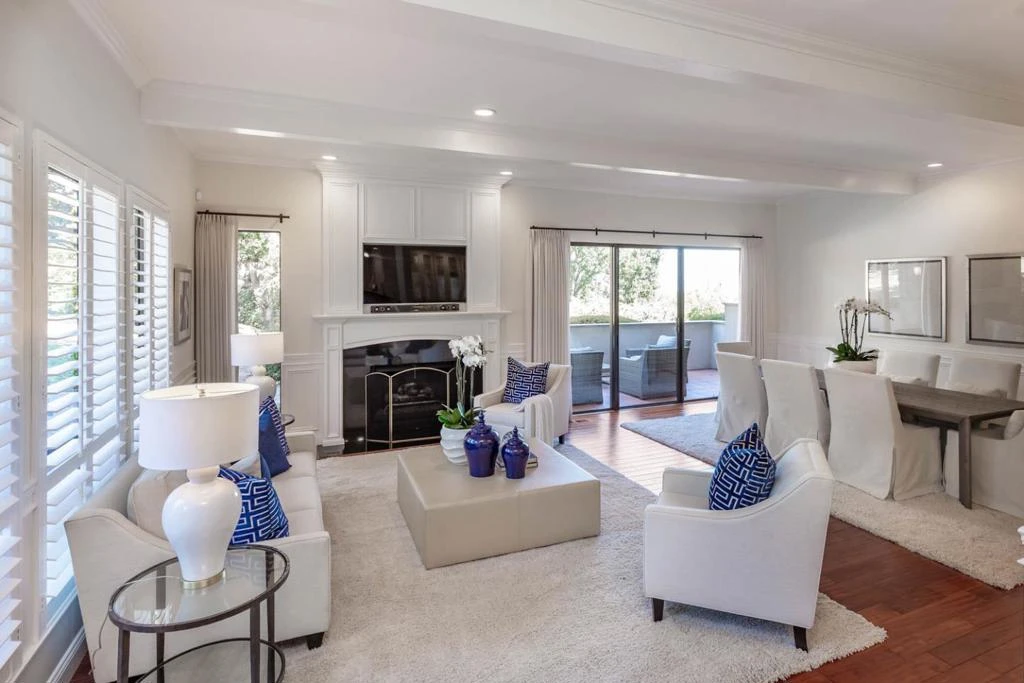 Showcasing a premier ground-floor location & extensive remodeling, this condominium makes a commanding first impression upon entry through the gated garden courtyard with fountains. End-unit location features three private patios with views of open space, the San Francisco Bay, & the East Bay hills. Inside, the foyer & hallway are extra wide, enhancing the spaciousness of the open & flowing floor plan. Entire home has been remodeled with engineered wood floors finished in a hewn style, complemented by crown moldings, wainscot details, & custom window shutters. Boasting one of the largest floor plans, the home spans approximately 2,850 square feet on a single convenient level. The dramatic living room features a fireplace and offers full advantage of the Bay views, with a built-in wine bar enhancing the space for entertaining. The community amenities at 1000 Sharon Park Drive further elevate the lifestyle, featuring a pool, spa, and clubhouse. With proximity to Sharon Park, just two blocks away, and the Sharon Heights Shopping Center, only a mile away, recreation, dining, and shopping are all within easy reach. Additionally, this home provides access to excellent Las Lomitas schools and is just minutes from the renowned venture capital centers on Sand Hill Road.