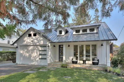 Special street in Menlo Park! This approximately 2,486 square foot single-level home offers four bedrooms and three and a half bathrooms. The modern farmhouse-style design features vaulted ceilings, skylights and transom windows, to list just a few details creating a spacious and airy atmosphere throughout the living areas. The Calcutta marble island and Quartz countertops, and stainless appliances in the kitchen provide a sleek and functional space for the discerning chef, complemented by the vaulted ceilings, skylights and abundant windows that flood the space with natural light. The home's expansive primary bedroom suite includes dual closets, and a generously sized en-suite bathroom, with dual vanities, tiled shower, and standalone tub. Another bedroom has an adjacent bath, and the other two bedrooms are connected with a walk-through bathroom with separate vanities. Modern details and convenience include Nest thermostats, dual tankless water heaters, air conditioning, and Sonos sound system. The Connecticut bluestone porch entrance and intimate back deck extends the living space outdoors, providing a tranquil setting for relaxation or gatherings.