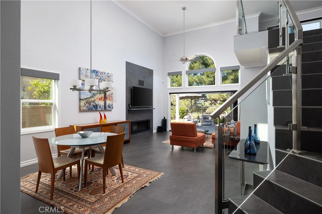 Ultra-chic, high-tech, modern home with tasteful, contemporary upgrades. Sleek Italian laser cut 24 inch porcelain tiles throughout. Tri-folding California doors with horizontal screens open up the entire downstairs offering an indoor-outdoor feel. Glass walls with brushed nickel metal finishes open up the loft boasting picturesque sunset views highlighted by yet another California door. The loft has a private balcony and a closet inset and could easily be a third bedroom. Marble counter tops in the kitchen with top of the line stainless appliances including 30,000 BTU professional Viking gas cooktop and white cabinetry with pull-out shelving. App controlled Hunter Douglas blinds, Porcelanosa fixtures in the primary bath, Lennox AC unit with over 1200 speeds, owned solar with 17 large panels affording continuous monthly savings. The list goes on and on. All this and more on a cul-de-sac street with a perfect yard, top rated schools and close proximity to shopping and Lake Mission Viejo. Even a main floor primary bedroom. The picturesque yard offers multiple seating areas, an elevated gazebo, room for gardening, privacy and a pleasant view. This is the home you have been waiting for. Better hurry on this one.