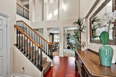 This beautiful home welcomes you with gorgeous curb appeal, highlighted by an aggregate-accented driveway, newer wrought iron fencing & dramatic up-lighting at the front entry. An elegant ornamental iron front door opens to a stunning 2-story foyer that sets the tone for the thoughtfully designed interior. Inside, rich Brazilian HW flooring & honed slate create a timeless & sophisticated feel throughout the main living areas. The formal living & dining rooms are open & airy, offering direct access to the beautifully manicured backyard—ideal for both everyday living & entertaining. A charming upgraded powder room adds a stylish touch for guests. The upgraded chef’s kitchen is the heart of the home, featuring a large center island w/pendant lighting, abundant cabinetry, double ovens, 6 burner gas cooktop, large stainless steel sink, a dedicated coffee bar, upgraded wall outlet plates & a breakfast nook for casual dining. The kitchen flows seamlessly into the cozy family room, complete w/fireplace & access to the serene backyard.Upstairs, the spacious primary suite is a true retreat, boasting a spectacular remodeled bathroom w/a large walk-in shower, stand-alone modern soaking tub, dual sinks, a dedicated vanity area, custom stylish cabinets, custom wall backsplash, light up vanity mirrors & an oversized walk-in closet. Bedrooms 2 & 3 are thoughtfully located away from the primary suite, offering privacy, & are served by an upgraded secondary bathroom w/dual sinks and a separate room for toilet & shower/tub. A convenient workspace sits just outside the bedrooms, perfect for a home office or study area. The upstairs laundry room offers space for a full-size washer & dryer along with ample cabinetry for storage. There is possibility for a fourth bedroom, as the single-car garage—currently used as a home gym—can easily be converted into an additional bedroom. In addition, the two-car garage has custom overhead storage. The park-like backyard is a peaceful oasis w/a soothing fountain & plenty of space to personalize, garden, or entertain. Notable upgrades include a 5-ton A/C condenser, solar panels, a quiet smart garage door, new irrigation control, ceiling fans, upgraded slider screen, surround sound with Bose speakers, rain gutters, new paint, plantation shutters, EV charger, many thoughtful enhancements throughout. This exceptional home offers comfort, style, and flexibility in a beautifully maintained setting—ready to be enjoyed! Don't miss this one!
