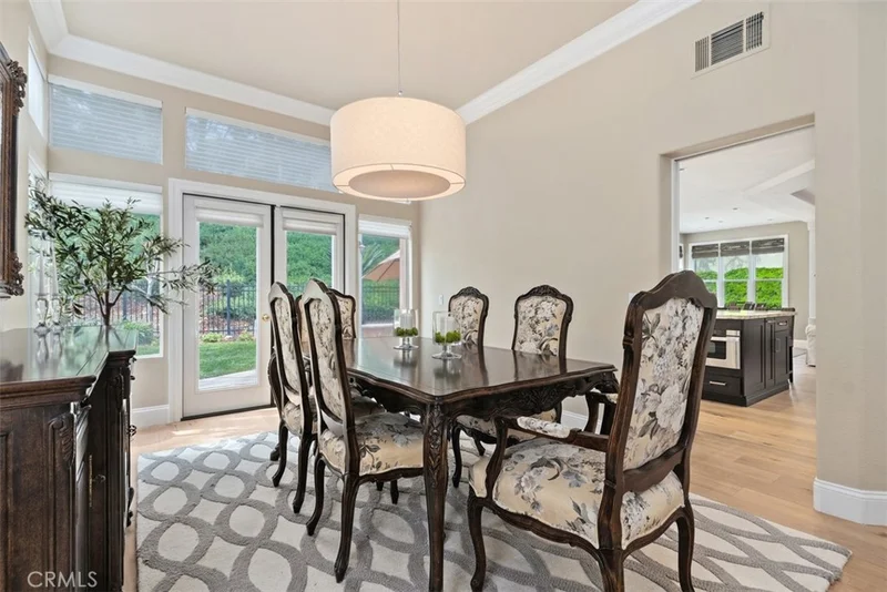 Welcome to this beautifully upgraded home in the highly sought-after Califia neighborhood of Mission Viejo. Ideally located on a quiet single-loaded view street, this impressive 5-bedroom residence blends timeless elegance with modern upgrades and thoughtful design. Step through the entry into a dramatic foyer with soaring cathedral ceilings and an abundance of natural light. Spacious living areas are highlighted by numerous windows and quality upgrades throughout, including Provenza engineered hardwood flooring, upgraded baseboards, and crown molding. The formal dining room is perfect for entertaining and features French doors that open to the patio and lush backyard, creating seamless indoor-outdoor living and an ideal setting for al fresco dining. The updated kitchen is the heart of the home, showcasing a large center island with granite countertops, upgraded cabinetry, recessed lighting, and stainless steel appliances including a Thermador 6-burner cooktop and double ovens. The kitchen flows effortlessly into the family room, complete with custom cabinetry, recessed lighting, and plenty of space for gatherings. The main level also offers a versatile bedroom and ensuite full bathroom, ideal for guests or multi-generational living, in addition to a powder room adjacent to the large living room. Upstairs, the spacious primary suite features a cozy fireplace and bonus sitting area that can be used as a retreat, office, or reading space. The beautifully updated primary bathroom includes travertine flooring, upgraded cabinetry, granite countertops, a soaking tub, separate walk-in shower, and a generous walk-in closet. Three additional upstairs bedrooms are generously sized and share an updated bathroom with tile flooring, granite countertops, and a tub/shower combination. Recent upgrades include a newer roof, dual HVAC systems, and full home re-piping for added peace of mind. Enjoy exclusive Lake Mission Viejo membership with access to two sandy beaches, boating, fishing, summer concerts, and year-round community events. The home is conveniently located near award-winning schools, including highly regarded Bathgate Elementary just down the street. With a convenient 3 car garage, low taxes, no Mello-Roos, and easy access to freeways, shopping, dining, and miles of hiking and biking trails, this exceptional home offers the very best of Mission Viejo living.