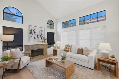 Don't miss this Mission Viejo condominium with stunning mountain views, located in the gated lakefront community of Finisterra on the Lake. This spacious two bedroom, two bath unit features a large loft, high ceilings and views galore. As you enter this open, light and bright unit, you're greeted with soaring ceilings and views straight out to Saddleback Mountain. Just off the entry is the kitchen with granite countertops, recessed lighting, breakfast nook, loads of pantry space and stainless steel appliances. The seamless flow of the living area is highlighted by a centrally focused fireplace and new dual pane floor-to-ceiling windows. A new sliding glass door leads to the private balcony where the views continue onto Lake Mission Viejo. The cozy dining area is enhanced by a built-in buffet with granite countertop, wine rack and refrigerator that's perfect for entertaining guests. The large primary suite features an ensuite bathroom with large walk-in shower, walk-in closet and new dual pane sliding glass door and window with spectacular views. The secondary bedroom is conveniently located away from the primary suite, and offers its own full bath that's completely remodeled with quartz countertops, shaker-style cabinets and more. Upstairs you'll find the large loft space with Murphy bed, and a bonus nook that is perfect for a home office or play area. This condominium offers features such as automatic and horizontal blinds throughout, lots of closet space, recessed lighting, ceiling fans, a newer AC unit, detached garage with newer roof, separate private carport, inside laundry area with all appliances included and more. Living at Finisterra on the Lake means you have access to resort-style amenities including a sparkling community pool, private beach, lakeside boardwalk, boat docks, and all the recreation opportunities Lake Mission Viejo has to offer; from paddle boarding and kayaking, fishing, boat rentals, summer concerts, 4th of July fireworks and more. Enjoy the privacy and security of this gated community, with access to top-rated schools, nearby shopping and dining and easy access to major freeways and toll roads. With its unbeatable lifestyle, this is a rare opportunity to own a slice of lakeside living in Mission Viejo.