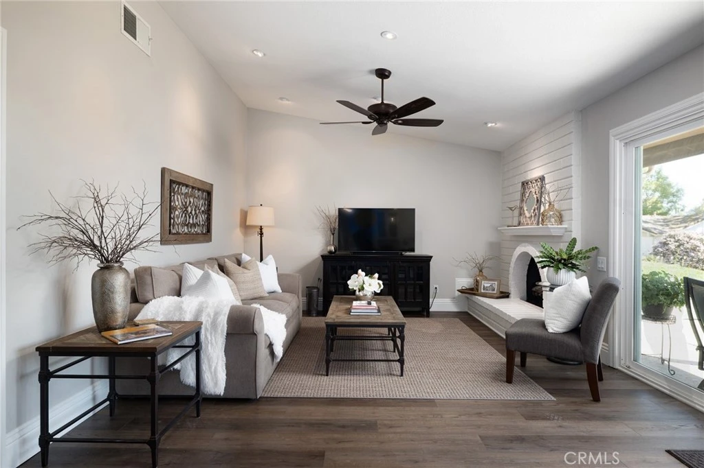 Stunning, upgraded two bedroom, single-story home in Casta del Sol with a view! Beautifully updated throughout, this home features attractive flooring and large baseboards, with a living room offering a brick fireplace, ceiling fan, recessed lighting, and scenic views. The dining area includes bar seating, elegant pendant lighting, and a beautiful countertop, opening to a remodeled kitchen with white mission-style cabinetry and stainless steel appliances, along with a beautiful view from the kitchen window. The primary bedroom features a ceiling fan, recessed lighting, plantation shutters, and a beautifully remodeled bathroom with mission-style cabinetry and an upgraded shower. The secondary bedroom includes plantation shutters and recessed lighting and the guest bathroom has also been tastefully upgraded. Enjoy outdoor living on the back patio with a patio cover, electric roller screen, and peaceful views. The property also has a private front entry and a prime single-loaded street location. Additional highlights include replaced windows and a sliding door, PEX repiping, AC and FAU, and an attached 1-car garage with direct access. Residents of Casta del Sol enjoy resort style amenities including a pool, spa, pickleball, tennis, bocce ball, lawn bowling, fitness center, library, gardens, and a variety of clubs and social activities.