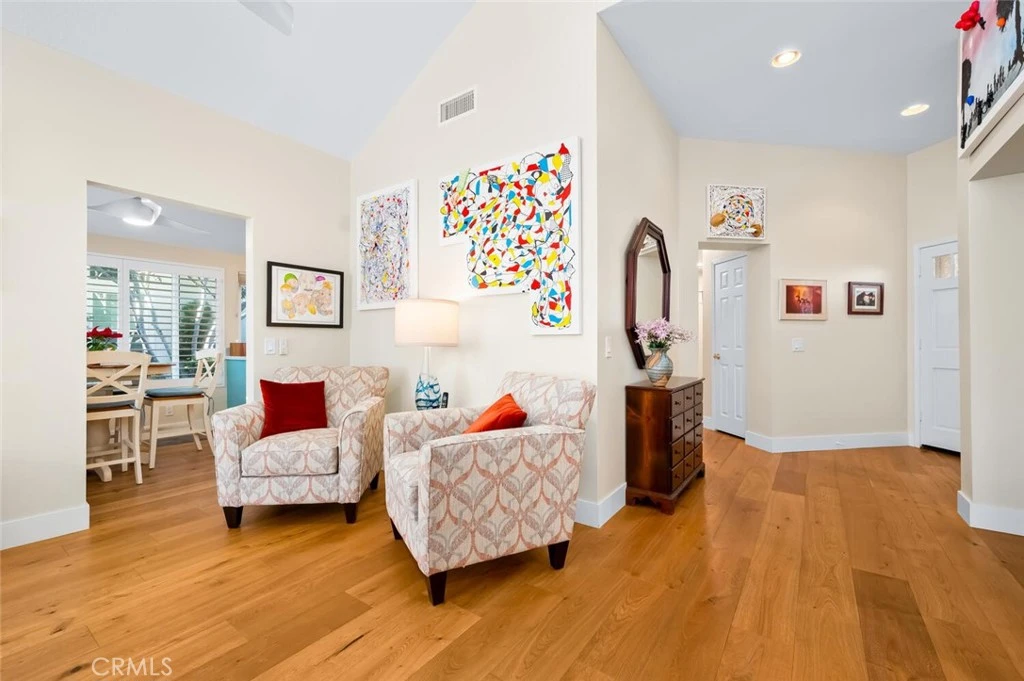 One of our favorites and soon to be yours within the 55+ Palmia community! Single Level, Two Bedroom PLUS Den/Office & Two Full Baths. This one is a Charmer with a Delightful Location and Fabulous Floor Plan. Entry way leads to a Great Room with Vaulted Ceilings and an Updated floor to ceiling Fireplace surround. Office/Den (no closet or door but could be added) is toward front of home with Bedrooms on opposite wings. Home features a FABULOUS REMODELED Kitchen with newer cabinetry, Quartz countertops, and GE appliances with Upgraded copper handles. Kitchen has a charming Nook for dining, Soft close Cabinetry, Light and Bright with several Windows overlooking the Greenbelt. Beautiful French Oak hardwood flooring, Plantation Shutters, and Ceiling Fans adorn the home. Decorator Wall in Secondary Bedroom. Primary Bedroom has Patio Access and also a REMODELED Ensuite bath - Walk in Closet, Dual Vanities and Shower. Both bedrooms have closet organizers to maximize the space. The Yard features areas for planting, dining and enjoying the outdoors. Patio Wall was built higher for added privacy and there is a gate direct for easy access to Greenbelt. The 2-Car Garage has an extended area for Washer/Dryer, Built in Cabinetry and Epoxied garage floor. Additional features include hideaway screen at front door, the home has been re-piped, newer water heater, newer heating/air conditioning units and Air ducts. Residents enjoy the Palmia Amenities including Clubhouse, Fitness Center, 3 Swimming Pools/Jacuzzi's, 18-hole Putting Green, Pickleball and Tennis Courts, Bocce, Shuffleboard +++. Mission Viejo Lake is also part of the Homeowners Association Amenities. This home is FABULOUS!