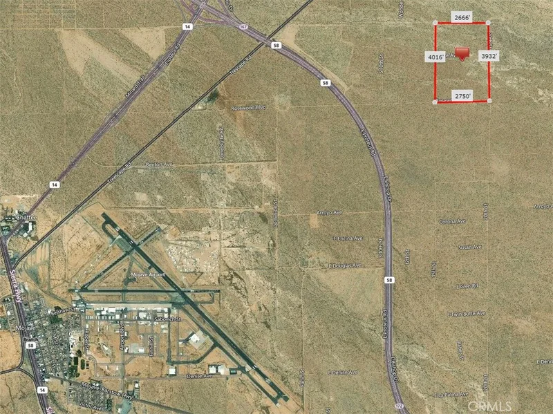 The listing price is for 40% share of 248+/- Acres of Vacant Industrial Land Zoned M-3 (Heavy Industrial) located Northeast of State Hwy. 58 and Hwy. 14 and Northwest of Hyundai Motor Group California Proving Ground, Mojave Air and Spaceport is to the Southwest. It has 2750' Frontage on Rosewood Blvd. and 3932' frontage on 20th St., Snake Ave goes through the property. Hwy. 14 is less than 2 miles away which gives you easy access to Rosamond, Lancaster, and Palmdale. Ideal for Cannabis, solar farming, truck stop, etc... You may google the following GPS coordinates to locate the subject: 35.095181 -118.103267