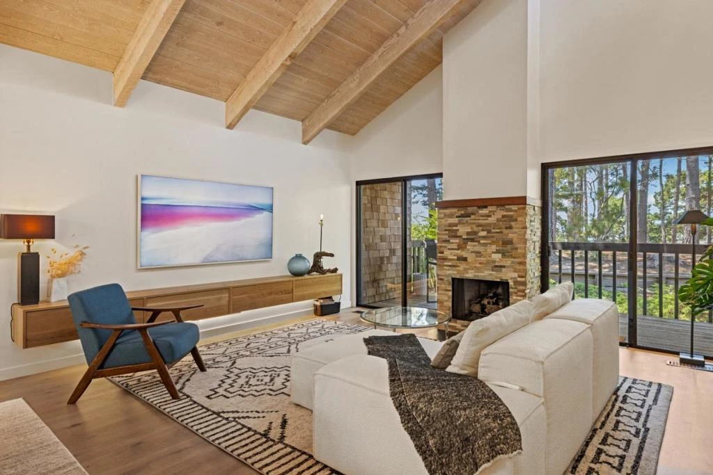 Enjoy peeks of Monterey Bay and the Pacific Ocean from this elegant home. Soaring ceilings, wide plank hardwood floors, clerestory windows and skylights create a welcoming environment full of natural light. Kitchen with large pantry, tile backsplash, gas range, and breakfast bar opens to dining-living room. Dining area with chandelier. Living room features stone fireplace between two glass doors to deck offering tree filtered ocean view. Primary bedroom ensuite with vaulted ceilings, high windows, view of Bay through glass doors and off balcony, custom designed closets. Spacious primary bathroom with large tile shower. Second and third bedrooms share a full bathroom and two closets including one walk-in. Front deck perfect for outdoor enjoyment with peeks of Bay and City. Two-car garage with laundry, extra storage space, finished floor. Parklike setting offers tranquility while conveniently located to shopping, dining, events and all the Monterey Peninsula has to offer.