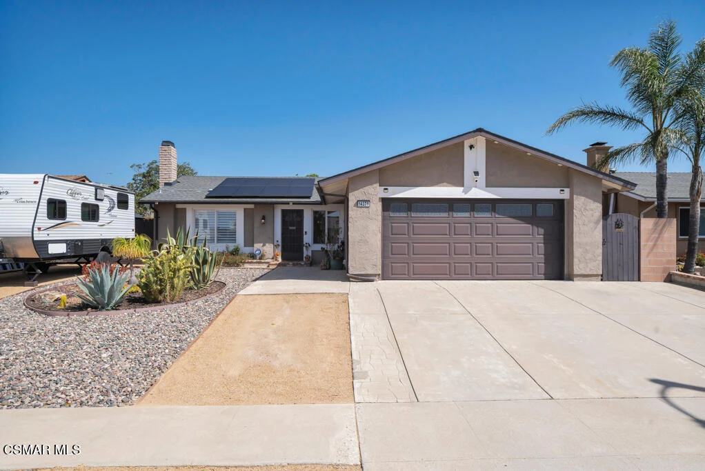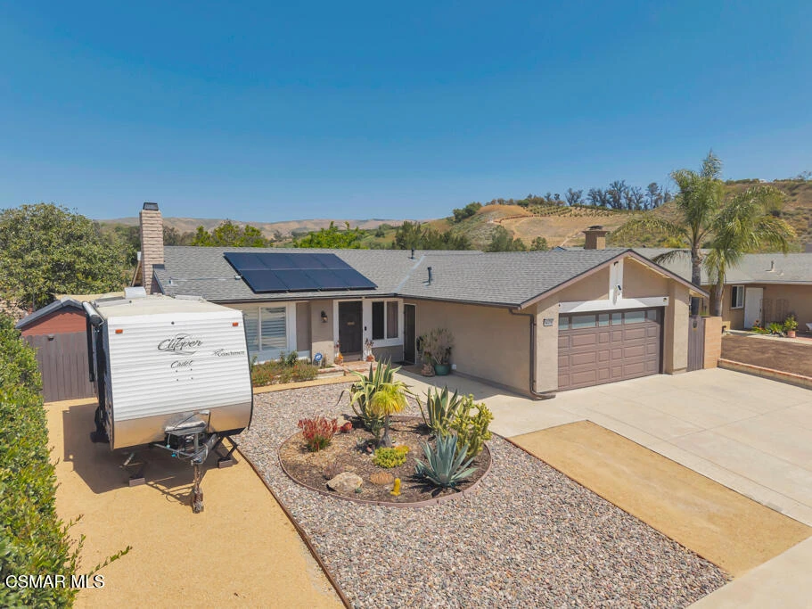 You'll feel right at home in this charming 3-bedroom, 2-bath residence featuring an open floorplan, soaring ceilings, and a long list of thoughtful updates. Perfectly situated to back up to open space along the Rustic Canyon Golf Course, this home offers beautiful mountain views and added privacy.Upgrades abound, including an owned solar system, dual-pane windows, newer roof and water heater, RV parking, and two fully remodeled bathrooms. The spacious layout features a large living room with a cozy fireplace and vaulted ceilings, a bright kitchen with granite countertops, stainless steel appliances, and a breakfast bar, plus a generous dining area with a sliding door leading to the backyard.Additional highlights include custom hallway cabinetry, a beautifully remodeled hall bath, and a sizable primary suite with a walk-in closet, updated bathroom, and views of the rear yard and surrounding mountains.The exterior is just as inviting, with custom front landscaping, ample parking including space for a camper, a large side yard with a shed and BBQ area, and a serene backyard filled with mature shade and fruit trees, a patio, and sweeping southern mountain views.Located in a quiet corner of Moorpark, this home is conveniently close to the 23 Freeway, Moorpark College, charming downtown Moorpark and all the shopping and restaurants Moorpark has to offer.This is a home you won't want to miss!