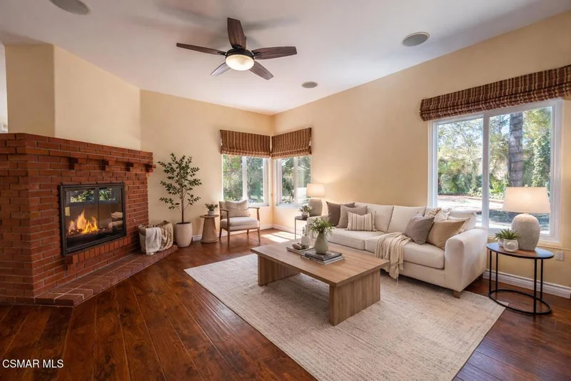 Beautiful 4 Bedroom, 3 Bath home located at the end of a Quiet cup-de-sac in the desirable Campus Hills neighborhood at the top os University Drive Moorpark.This private Location sits in the Middle of the neighborhood and offers peace and tranquillity with minimal traffic.The home features wood like flooring in family, living, and dining rooms, with tile in the kitchen and entry way, and bathrooms.New interior paint and new carpeting has been installed, making the home fresh and move-in inready.The kitchen includes granite countertops, and newer cabinets, microwave , gas oven and stove, and the refrigerator is included. All 3 bathrooms have been updated. A shared fireplace serves both living and family room, creating a warm and inviting space. Ceiling fans are installed in the bedrooms, family room and a ChandelierUpstairs a skylight in the hallway brings in natural light, and the bedrooms have built-ins for added storage and convenience.The primary Bedroom features private balcony/deck overlooking the back yard patio area.Sliding Glass Doorsin both living and family rooms provide access to the backyard. The backyard offers palm trees, colored concrete, and a fire pit area for entertaining and relaxing.Additional highlights include a 3 car garage, and a location close to shopping, schools, and transportation, and a freeway access while being tucked away in the neighborhood. The community pool and spa are conveniently located on University. Has built in Speakers in the downstairs area, and a Smart Leak Detection Device and surround speakersinside and Out.This home shows Pride of Ownership, and Has Sun Run Solar offers Great Value in Moorpark, with plenty of space to Live and entertain..
