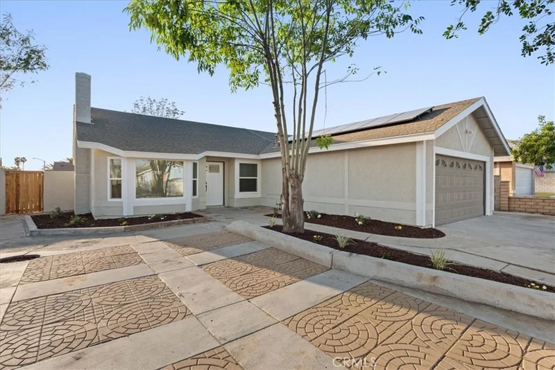 Welcome to this beautifully remodeled single-story 4-bedroom home on a desirable corner lot situated on a cul-de-sac street. Thoughtfully updated inside and out, the property offers potential RV parking (and more), fresh exterior and interior paint, new dual-pane windows, a new vinyl slider, extensive new fencing, and attractive low-maintenance landscaping. New heating and air condition system as well, WOW!! Step inside to dramatic open-beam vaulted ceilings that flow into a large, open kitchen featuring a breakfast bar overhang, new shaker-style cabinets, quartz countertops, and stainless-steel appliances. The home has all-new wood-look flooring in the living areas and plush carpet in the bedrooms, complemented by Craftsman baseboards and casings and modern designer finishes throughout. Bathrooms have been tastefully renovated with new vanities and showers. Enjoy a generous backyard with a covered patio — perfect for entertaining and outdoor living. Additional perks include the cost effective tax rate and no HOA. This turnkey home blends contemporary finishes with single-level convenience — schedule a showing today!
