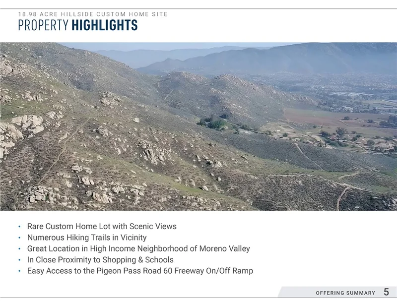 • Rare Custom Home Lot with Scenic Views • Numerous Hiking Trails in Vicinity • Great Location in High Income Neighborhood of Moreno Valley • In Close Proximity to Shopping & Schools • Easy Access to the Pigeon Pass Road 60 Freeway On/Off Ramp