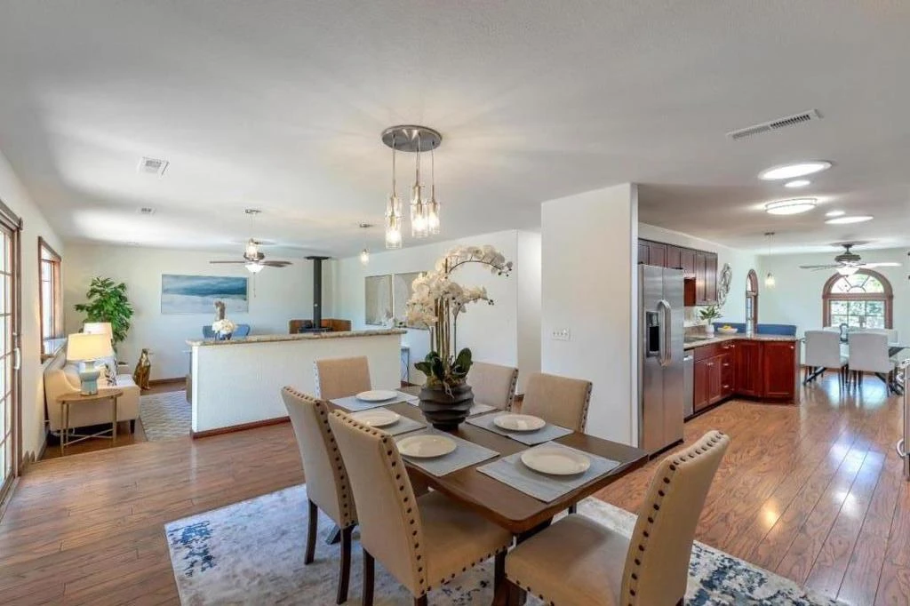 Welcome to this charming single-story 4-bedrooms, 2-bath home offering 1,723 Sq Ft of comfortable living space. The spacious living room features a cozy wood-burning fireplace, perfect for family gatherings or relaxing evenings. Adjacent is the bright dining room with sliding door access to the backyard for indoor-outdoor living. The kitchen features stainless steel appliances, granite countertops & ample cabinet space. A large breakfast area with additional counter seating ensures plenty of room for casual meals and morning coffee.The master suite offers generous closet space and a freshly remodeled en-suite bathroom featuring a double sink vanity. Keep cool with combo fan light fixtures in the living room and all the bedrooms. Fresh paint throughout, tunnel skylight and new carpet in all the bedrooms. The expansive 9,258 SqFt corner lot features a sparkling heated swimming pool, a greenhouse, and wide side yards. The backyard is perfect for hosting gatherings or simply enjoying the outdoors. Front yard has a sitting area with a pergola, raised garden beds & low-maintenance landscaping. Additional features include leased solar panels and an EV charging port in the garage, making this home eco-friendly and future-ready. Don't miss the opportunity to make this your forever home!