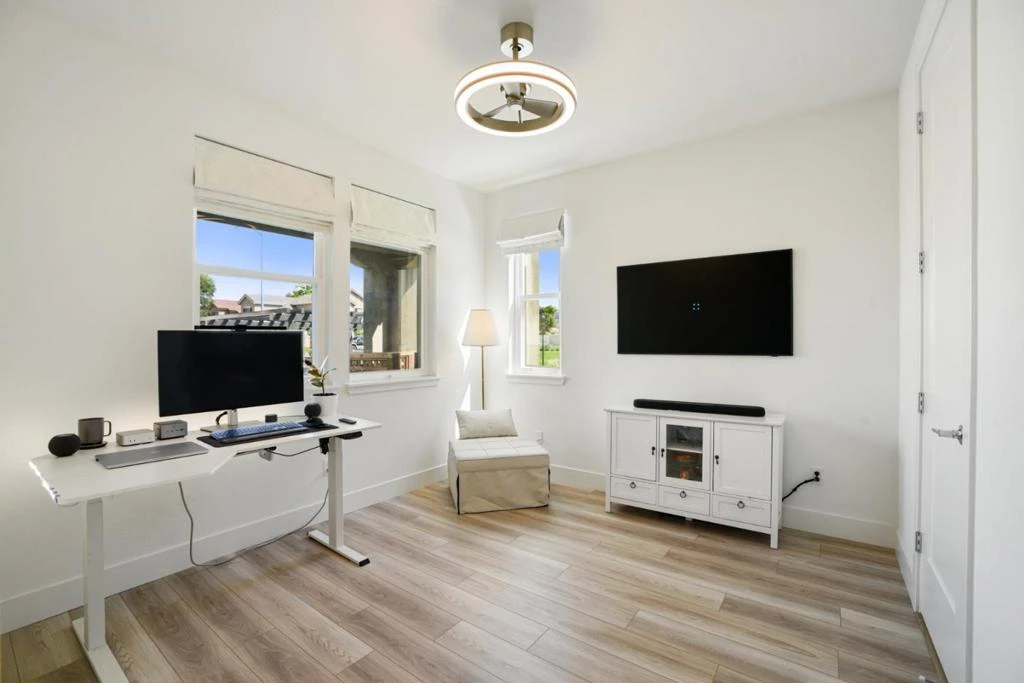 Welcome to this beautifully upgraded, like-new end-unit townhome, built in 2024, offering rare privacy, open outlooks, and abundant natural light. Ideally positioned to face greenery rather than neighboring homes, it creates a bright and airy feel throughout. The open-concept layout features a light-filled living space with large windows and seamless flow for everyday living and entertaining. Entire home upgraded to LVP Flooring. Enhanced by $55K+ in builder upgrades, plus high-end appliances, smart home features, Samsung Frame TVs, Solar and an attached two-car garage with epoxy flooring + EV charging. Enjoy a ground-floor bedroom and full bath for added flexibility, with spacious and bright bedrooms upstairs. Conveniently located near parks, shopping, dining, and major commuter routes- this is a RARE opportunity to own one of the best-situated homes in the community!!