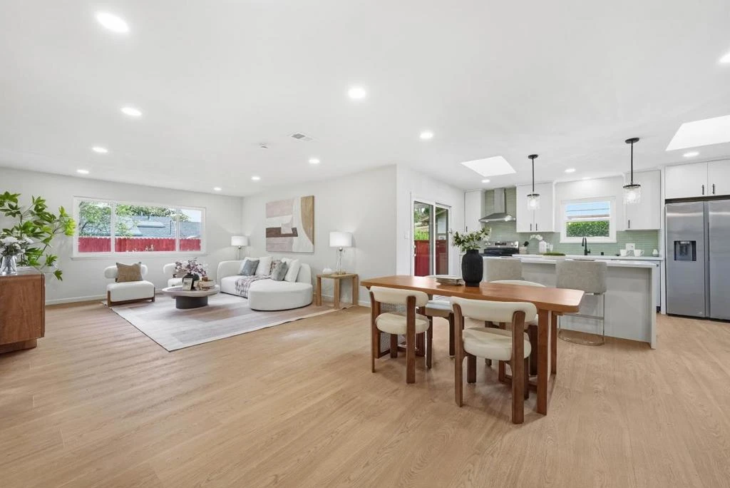Beautifully updated single-story home featuring 4 bedrooms, 2 bathrooms, and approximately 1,389 sqft of thoughtfully designed living space. The bright and open-concept layout is filled with natural light, with a welcoming living room that flows seamlessly into the dining area and a fully remodeled kitchen. The kitchen showcases a large center island, quartz countertops, stainless steel appliances, skylights, and stylish cabinetryperfect for both everyday living and entertaining. Well-proportioned bedrooms offer comfort and flexibility, while the updated bathrooms feature clean, modern finishes. Wide-plank flooring, recessed lighting, and fresh interior updates create a cohesive and airy feel throughout. Step outside to a spacious backyard with a covered patio, ideal for outdoor dining, relaxing, or hosting gatherings, with ample space for gardening or future possibilities. Additional highlights include an attached two-car garage and a peaceful, established neighborhood setting. Conveniently located near major tech campuses, parks, shopping, and key commute routes, this move-in ready home offers the perfect blend of comfort, style, and everyday convenience.
