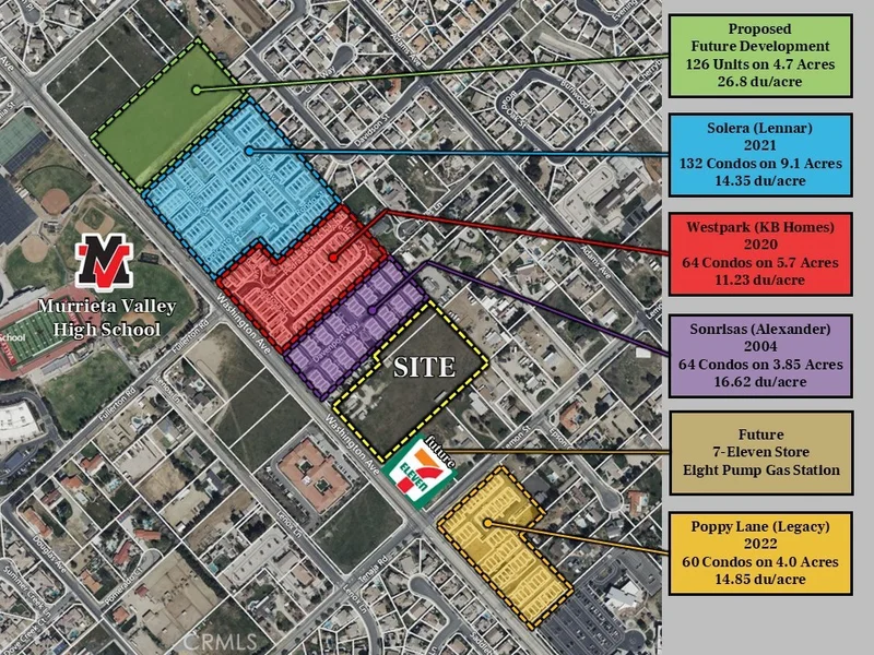 The property for sale is a ±5.34 acre development site located at 24264 Washington Avenue in the city of Murrieta, CA. The site is composed of two parcels of land with APNs 906-780-035 & 037 and the site is generally level/rectangular in shape with 330’ of frontage along busy Washington Ave. There are currently two older single-family homes on the site. Zoning on the site is NC – Neighborhood Commercial and the General Plan Land Use designation is Commercial. The NC zoning district is designed for areas appropriate for convenience shopping, including individual retail and service uses and small destination centers on sites generally 3-10 acres in size. Directly to the south of this property is a site that has recently been approved for a 7-Eleven convenience store with an 8-pump gas station. This site benefits from close proximity to downtown Murrieta as the property is just blocks to the north of historic Old Town Murrieta which is known for its vibrant art scene and large number of shops and restaurants. The property is also just 3 blocks to the west of the I-15 freeway and is one block to the south of Murrieta Valley High School. There are several newer residential projects along this immediate stretch of Washington Avenue including a 60-unit project from Legacy Homes, a 64-unit project from KB Homes, a 64-unit project from Alexander Communities and a 132-unit project from Lennar. The city of Murrieta has a huge residential development pipeline at this time and the demand for local retail will only grow with the population of the city.
