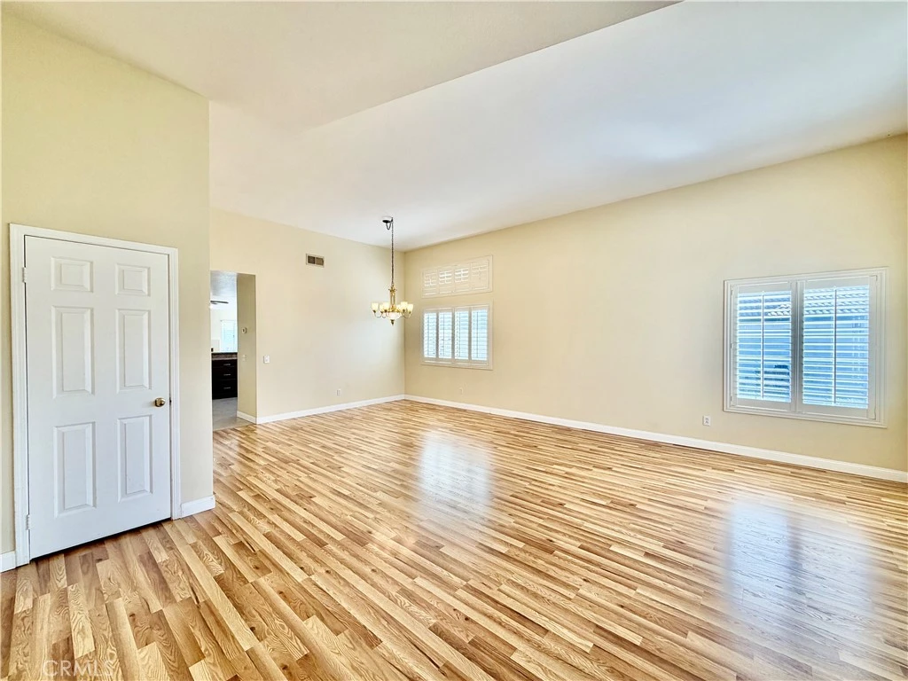 Welcome home to this lovely 3 bedroom, 2 bathroom home featuring both a living room and family room, plus an extensive covered patio and spacious backyard. As you approach, enjoy the low maintenance landscape and attractive curb appeal highlighted by turf. Upon entering the home, you will first notice the utility closet and the spacious living room area, which can also function as a dining space. Plenty of shutters are present, allowing for an abundance of natural light, along with updated flooring that complements the space nicely. Continuing through the home, you will find the open kitchen and family room. The kitchen offers tile flooring, breakfast bar seating, dark wood cabinetry, and elegant countertops. Heading down the hall, you will first come across the restroom serving the secondary bedrooms, complete with a shower and tub combo and white cabinetry. The two bedrooms before the primary offer ample closet space, generous sizing, hard surface flooring, and tall ceilings. The primary suite features elevated ceilings, a walk-in closet, and direct access to the backyard. The en-suite restroom provides dual sinks, sleek white cabinetry, and a walk-in shower. Out back, you will find the great-sized covered patio and a vibrant green open area, perfect for relaxing or entertaining. The 2-car garage also includes extra storage cabinets for added convenience. An additional notable feature in this home is luxury hard surface flooring throughout the entirety of the home. Located in proximity to local schools, shopping, fine dining, freeway access for commutes, and so much more!!! Schedule your private showing today homes like this in Murrieta do not last long!
