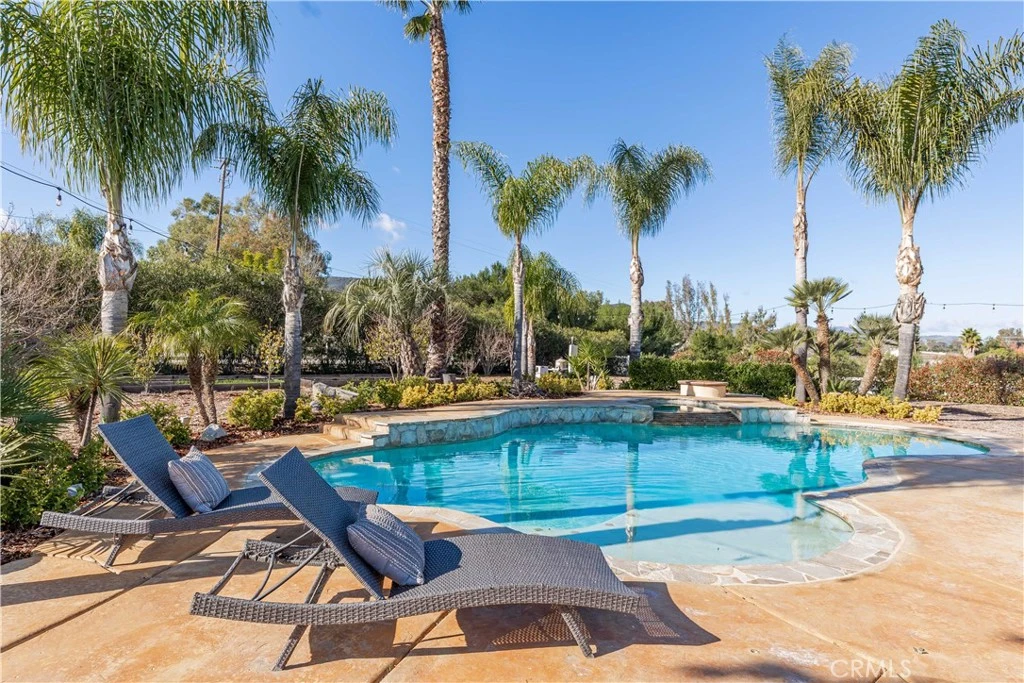 Welcome to this expansive estate nestled within the exclusive gated community of Wynfield Estates in Murrieta. Set on 2.3 acres of private, usable land, this impressive two-story residence offers a rare blend of space, comfort, and resort-style living surrounded by rolling hills, scenic views, and the peaceful ambiance Wynfield Estates is known for. Ideally located near top-rated Murrieta schools, shopping, dining, and Temecula wine country, this home delivers both privacy and convenience. A charming wraparound porch and grand entry invite you inside, where tall ceilings, real wood floors, and abundant natural light create an immediate sense of scale and warmth. The thoughtfully designed floor plan opens seamlessly upon entry, featuring a formal dining room perfect for gatherings, expansive living areas, and an inviting flow throughout the main level. A spacious downstairs office offers views of the backyard and the gorgeous mountain backdrop beyond, creating an inspiring work-from-home setting. A full bedroom and full bathroom on the main level provide flexibility for guests or multigenerational living. Additional highlights include a half bath, storage closet, and a large laundry room with sink and wash-off area. Upstairs, a dramatic stairway window fills the home with natural light and leads to generously sized bedrooms, each with direct bathroom access. The primary suite is a true retreat, showcasing a fireplace, an enormous private deck ideal for taking in the sweeping views, a spacious bathroom with soaking tub and separate shower, and dual walk-in closets. Secondary bedrooms include a Jack-and-Jill configuration and oversized walk-in closets, offering comfort and functionality throughout. Designed for entertaining and outdoor enjoyment, the backyard is a private oasis featuring lush grass, stone pathways, garden beds, a children’s play area, fire pit, and a sparkling pool and spa with spill over into the pool. An Alumawood deck supported by reinforced concrete pillars creates the perfect space for outdoor living, while a prepped outdoor kitchen area awaits completion. Beyond the pool lies over an acre of additional usable land, offering endless possibilities for recreation, expansion, or future amenities. Additional features include a 4-car attached garage with epoxy flooring and paid-off solar. This exceptional estate offers space, privacy, and an elevated lifestyle in one of Murrieta’s most desirable gated communities.