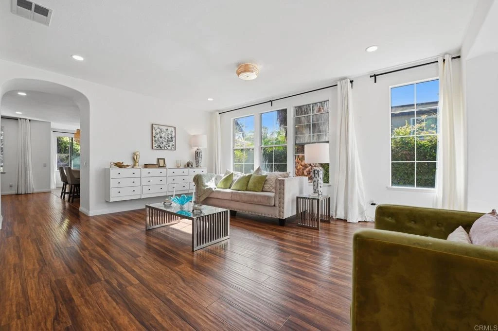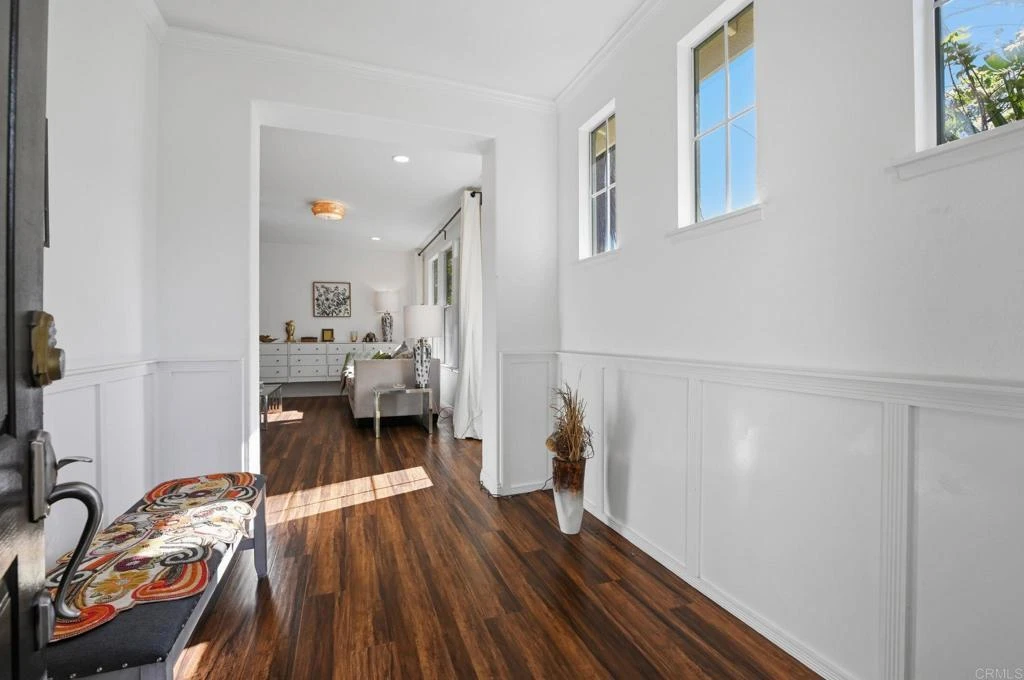A formal entryway adorned with beautiful wainscoting welcomes you into this single-story, light-filled home, where coved archways and soaring ceilings create an elegant, airy feel. The spacious living room flows seamlessly into the formal dining area, perfect for both everyday living and entertaining. At the heart of the home, the open-concept kitchen and family room offer the ideal gathering space. The kitchen features crisp white cabinetry, quartz countertops, a large center island with bar seating, stainless steel appliances, a large basin sink, and a generous pantry. A sunny breakfast nook with backyard views adds to the charm. The adjacent family room is warm and inviting, complete with a white brick fireplace and a media niche with built-in shelving. A generously sized bonus room and nearby half bath provide flexibility and could easily be converted into an additional bedroom or private in-law suite. Secondary bedrooms are spacious and well-appointed. The expansive primary suite offers a relaxing retreat, featuring a dual-sink vanity, soaking tub, and a separate glass-enclosed shower. Additional highlights include a separate laundry room with ample storage, an attached 3-car garage, and a private backyard with a covered patio and terraced garden area, complete with mature landscaping and citrus trees. Ideally located on a quiet cul-de-sac, just minutes from local schools, shopping, dining, and with easy freeway access, this home offers the perfect blend of comfort, space, and convenience.