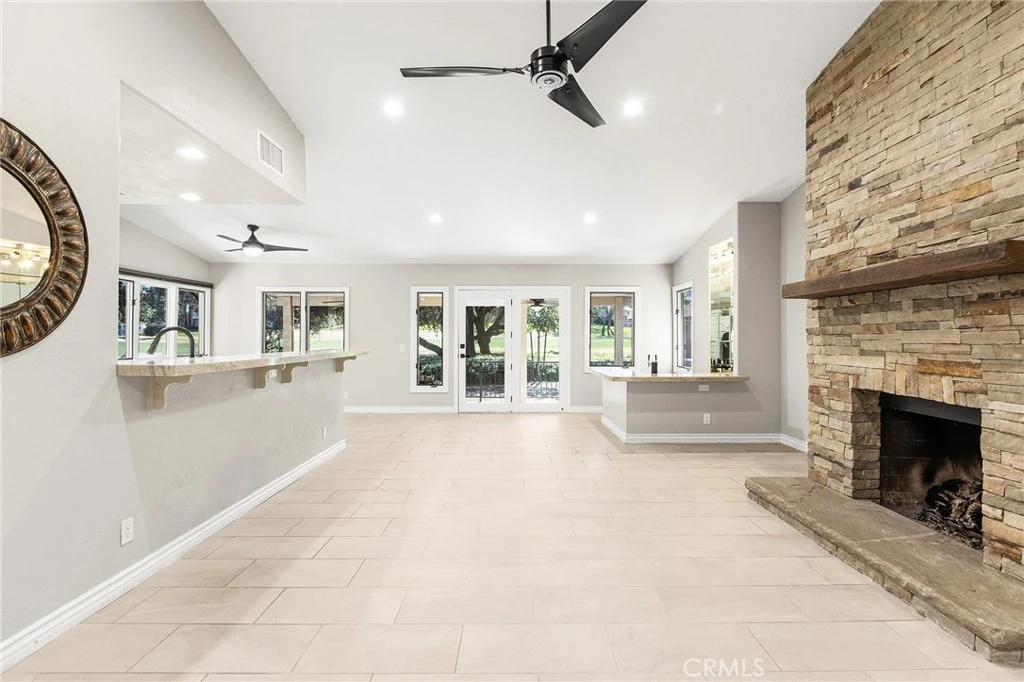 Gorgeous 2-bedroom, 2.5-bath single-story home perfectly positioned on the 17th fairway of the prestigious Jack Nicklaus golf course. This stunning residence has been beautifully remodeled throughout, offering the perfect blend of luxury, comfort, and seamless indoor-outdoor living. The kitchen has been completely transformed, with the wall between the kitchen and family room removed to create an open-concept great room ideal for entertaining. Highlights include exquisite quartz countertops with waterfall edging, updated cabinetry accented with gorgeous black hardware, high-end LG appliances, and modern LED lighting. The stylish wet bar has also been upgraded with beautiful quartz countertops, a sink, and a built-in beer keg — perfect for hosting gatherings. The open family room features a custom stone fireplace wall and breathtaking golf course views, creating a warm yet sophisticated focal point. Enjoy both an eat-at bar and a dedicated dining area for effortless entertaining. Both spacious primary suites offer private en-suite bathrooms, custom closet organizers, and custom doors leading directly to the backyard — providing seamless access to the tranquil fairway views. The main primary bathroom has been fully renovated with a large double vanity, custom mirrors, designer lighting, upgraded fixtures, and a stunning walk-in shower with gorgeous marble walls. The secondary en-suite bath also renovated and showcases a custom vanity, LED lighting, herringbone tile flooring, a tiled bath/shower combo, and elegant fixtures. The hall powder room is equally impressive with a custom vanity, updated lighting, gorgeous fixtures, and a striking decorative stone and tile accent wall. Custom Levolor window coverings throughout the home add both sophistication and functionality. Additional highlights include direct access to a 2-car garage with epoxy flooring and an abundant amount of cabinetry and overhead storage. Step outside to your private backyard oasis featuring an Alumawood covered patio, dedicated seating areas off each bedroom’s private access, a custom BBQ island complete with refrigerator, and breathtaking views of ancient oak trees and the lush fairway beyond. This is golf course living at its finest — remodeled, refined, and truly move-in ready.