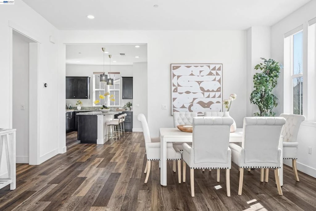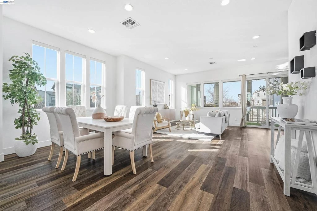This corner-lot single-family home perfectly blends modern sophistication with functionality. Spanning 2,412 square feet, this 4-bedroom, 3.5-bathroom residence is bathed in natural light, creating a warm and inviting ambiance throughout. The first floor features a private suite with a bedroom, full bathroom, kitchenette, and a separate entrance—making it an ideal space for hosting guests, accommodating extended family, or serving as a quiet retreat. Upstairs, you'll be greeted by soaring 10-foot ceilings and an open-concept design that exudes elegance and spaciousness. The upgraded kitchen is a chef's dream, showcasing a sleek oversized island, premium stainless steel appliances, and ample workspace to inspire culinary creativity. The dining and living areas flow seamlessly from the kitchen, leading out to a spacious covered patio. The home is finished with a tasteful mix of upgraded flooring and plush carpeting, adding layers of style and comfort to every corner. The community is close to Meta and Tesla, among other major employers. The residents enjoy a host of amenities like a park, a kid's playground, BBQ and picnic area. Nearby National Wildlife Refuge offers open space with trails and nature to explore. Easy access to Dumbarton bridge and I-880.