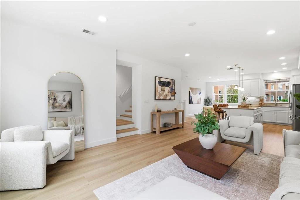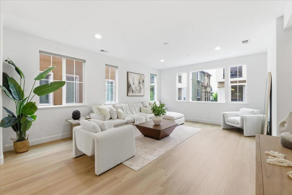 Experience the pinnacle of modern living in this stunning corner-unit townhome located in the heart of the gated Prima community. Thoughtfully designed for privacy and contemporary comfort, this residence boasts an open feel enhanced by abundant natural light and brand new flooring throughout. The chef-inspired kitchen features white shaker cabinets, premium stainless steel appliances, a brand new dishwasher, and a sophisticated textured tile backsplash. Retreat to a primary suite highlighted by tall ceilings, neutral tones, and a luxurious bathroom with a walk-in glass shower and patterned tile flooring. Additional highlights include a private garage, raised panel doors, and a low-maintenance outdoor space perfect for easy living. Ideally situated just minutes from premier retail and dining including Costco and NewPark Mall, this home offers unparalleled convenience with walkable amenities and seamless access to major commuter highways.