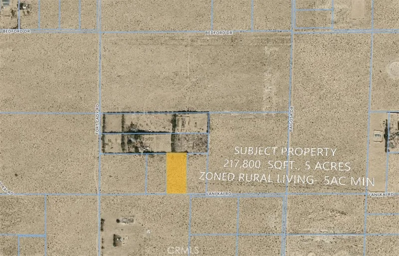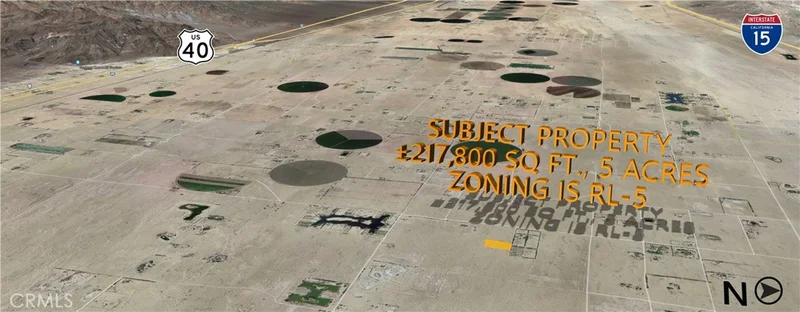 ±5 acre vacant land parcel in Newberry Springs. Adjacent to existing residential developments on both the north and south. Electricity runs along Fort Cady Rd approx. 1,200 feet to the west. Zoning is RL-5 – rural living allowing one primary dwelling unit per 5 acre minimum. Prime location for a future ranchette.